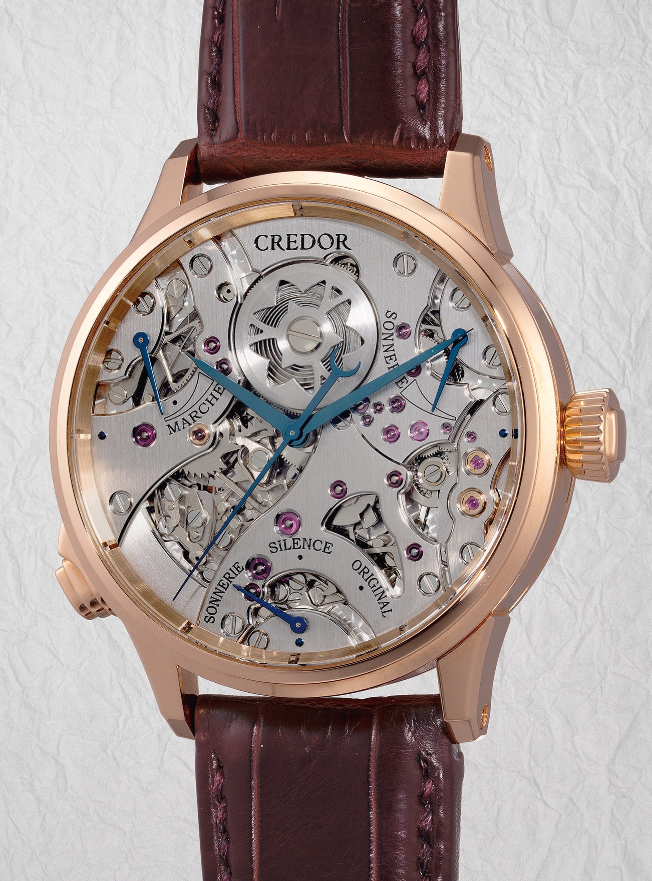 Cased in a 43mm pink gold case, the intricacy of the sophisticated semi-skeletonized movement invites you to witness a metropolis spectacle. Visually striking, the acoustic of the chime is equally remarkable. Divided into three modes: Sonnerie (chime every hour on the hour) , Silence (chime deactivated), Original (Chime in 3 hours interval 3, 6, 9 and 12 o’clock). The pusher at 8 o’ clock activates the hour repeating function with a gentle push.