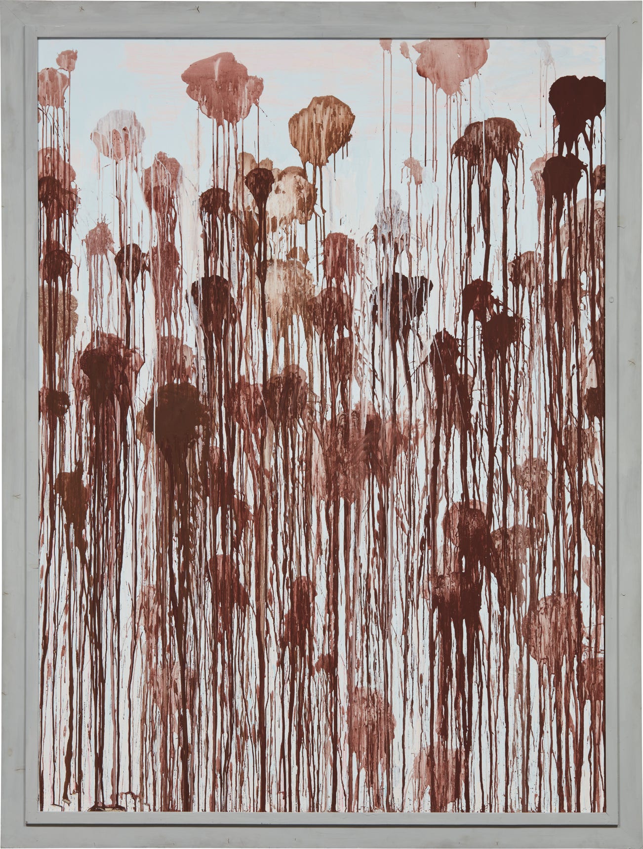 Executed in the final decade of Cy Twombly’s life, Untitled, 2004, is one of ten paintings that comprise the artist’s acclaimed Untitled (Winter Pictures) series. Coming full circle to his seminal series Poems to the Sea, which Twombly had created when he first became enchanted with the coastal landscape between Rome and Naples in 1959, Untitled (Winter Pictures) presents an epic painterly paean to the Mediterranean sea of his adopted home in Italy. Whereas Twombly had earlier in his career given up the brush for the pencil to intentionally suppress virtuosity, Untitled demonstrates how his technique evolved to exploit the loose gestures, broad daubs and spillage effects of paint. A remarkable example of Twombly’s inimitable painterly practice, Untitled is built up with coats of acrylic paint that the artist applied to the wooden panel with a combination of brush, cloth and hand. Having built up the ground with coats of quick-drying radiant white acrylic paint, Twombly activates the composition by repeatedly sweeping his drenched paintbrush down the length of the vast pictorial field. While all works from this series feature similar cascading vertical lines, Untitled is one of only two paintings distinguished by repeated circular blotches that run in splattering rivulets like dripping clouds beyond the edges of the pictorial support. While evocative of Twombly’s earlier blotches, the artist has here layered the forms through a process of gradated saturation that of thick and thinned torrents of earthy, reddish brown and white. Into this dense visual syntax Twombly introduces subtle flashes of yellow, light teal and red color, resulting in a sumptuous palimpsest that delights the senses.
