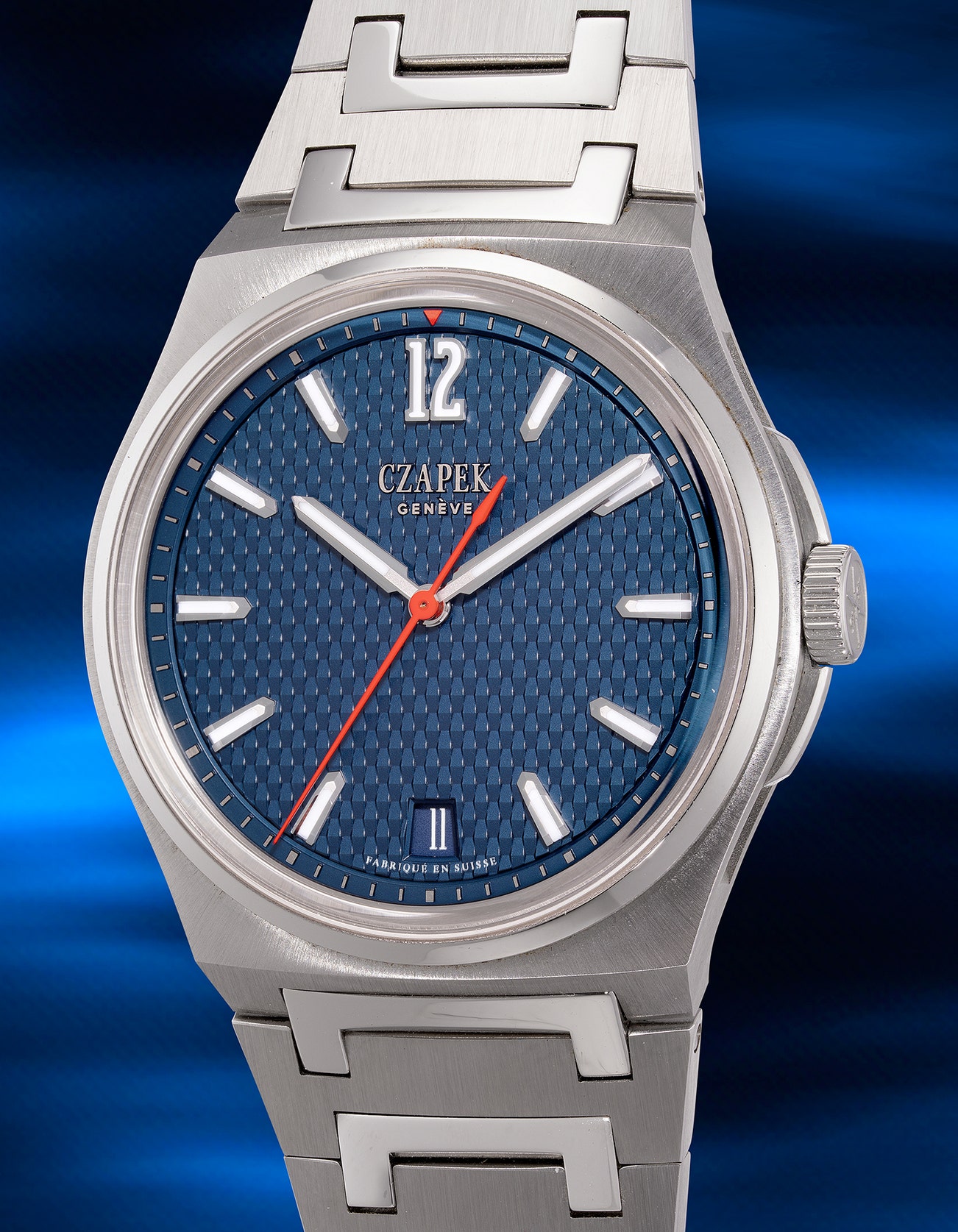 - Fitted with a brushed integrated bracelet, whose brushed links are themselves connected with highly polished links in the form of a “C” for Czapek. The bracelet further features a quick-change system to allow the wearer to interchange it with the rubber strap that is decorated with the same trapezoid pattern found on the dial.