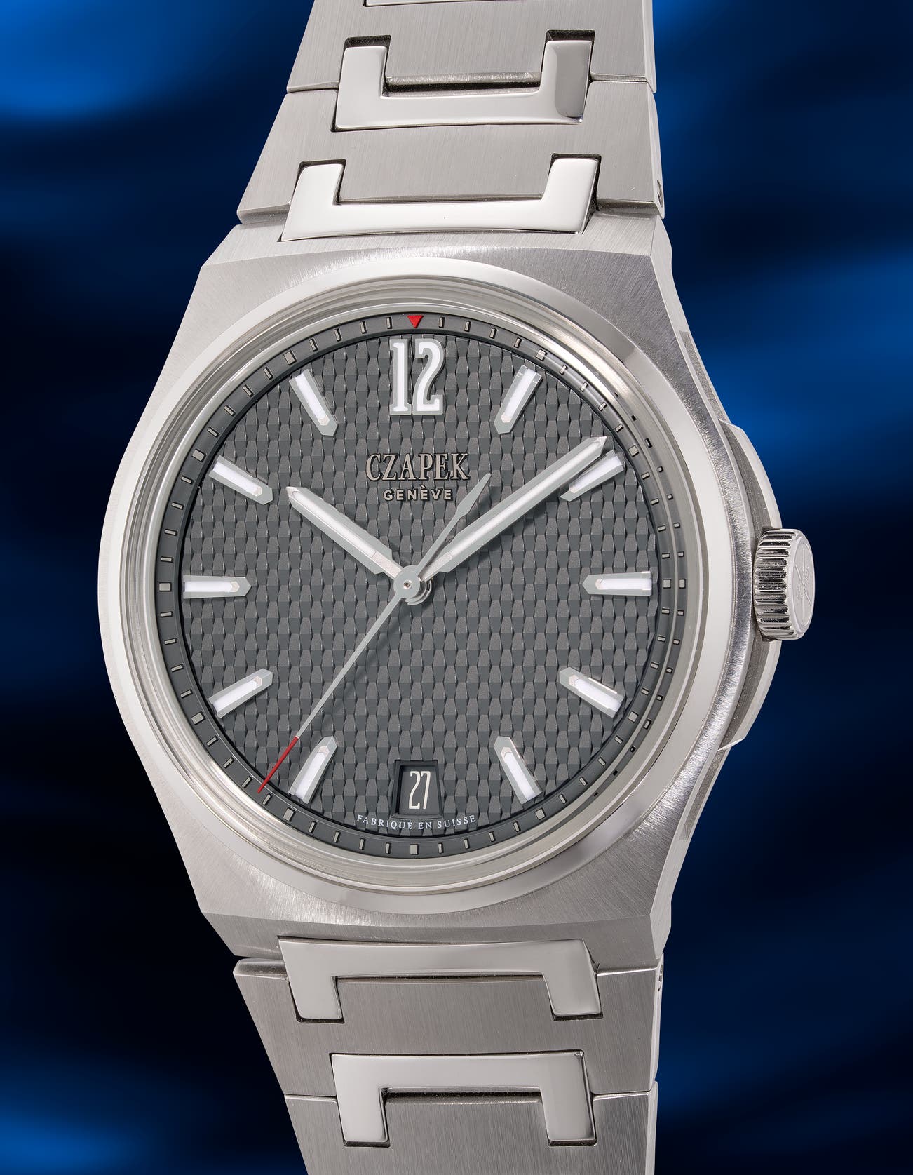 • The watch is powered by Czapek’s in-house automatic SXH5 movement, which is visible through the exhibition case back. The movement showcases modern architecture, skeletonized bridges, and a micro-rotor, offering both technical refinement and visual intrigue. The watch is fitted with a brushed integrated bracelet, where each brushed link is connected by a highly polished “C”-shaped link as a subtle nod to the Czapek name. A quick-change system allows the bracelet to be easily swapped for a rubber strap that mirrors the dial’s trapezoid motif.