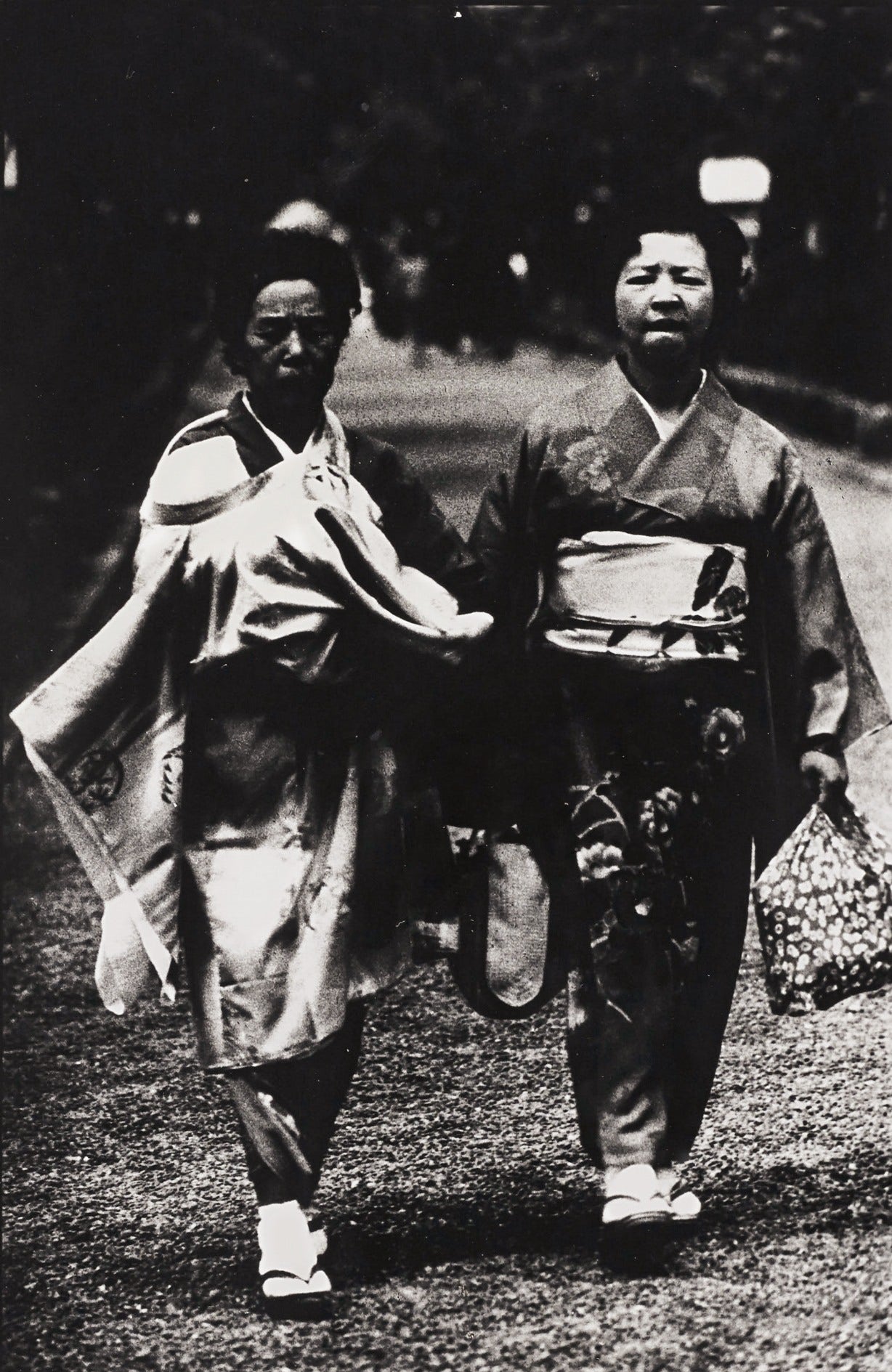 This is one of the seven photos printed in the July 1966 issue of Camera Mainichi magazine, collectively entitled Kamakura, one of the earliest series from photographer Daido Moriyama. The subjects are a mother, her daughter, and the daughter's baby, visiting Tsurugaoka Hachimangu, a massive shrine located in Kamakura, for Miyamairi, a traditional Shinto rite of passage for newborns. This exceedingly rare and early print is representative of Moriyama's unique photographic expression,formed alongside, yet distinct from, the influences of the older generation of influential photographers such as Shomei Tomatsu and Eikoh Hosoe. This vintage work also indicates how Moriyama was printing in this earliest stage of his career. His vintage prints of this period are highly treasured items; almost entirely collected by Tokyo Polytechnic University, they rarely appear on the market.