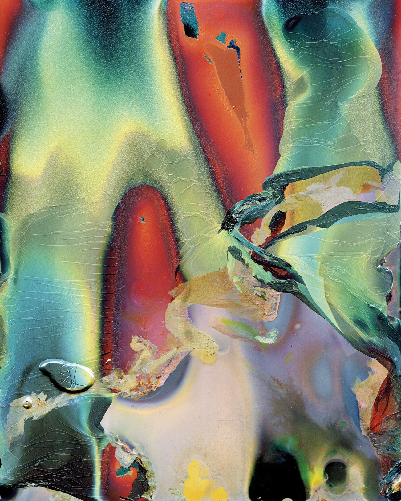Focusing on the materiality of photography, namely film and paper, Yokota creates abstract works through a novel approach of layering sheets of unused, large-format colour film, ranging in size from 4 x 5 to 8 x 10 inches. He develops the layers of unused colour film using boiling water to allow new colours to emerge as the emulsion melts and silver oxidizes, then the damaged sheets of film, which no longer can be developed, are scanned to create the final work. Yokota explains, ‘I tried to re-control time on a photograph by tuning up the particles.’