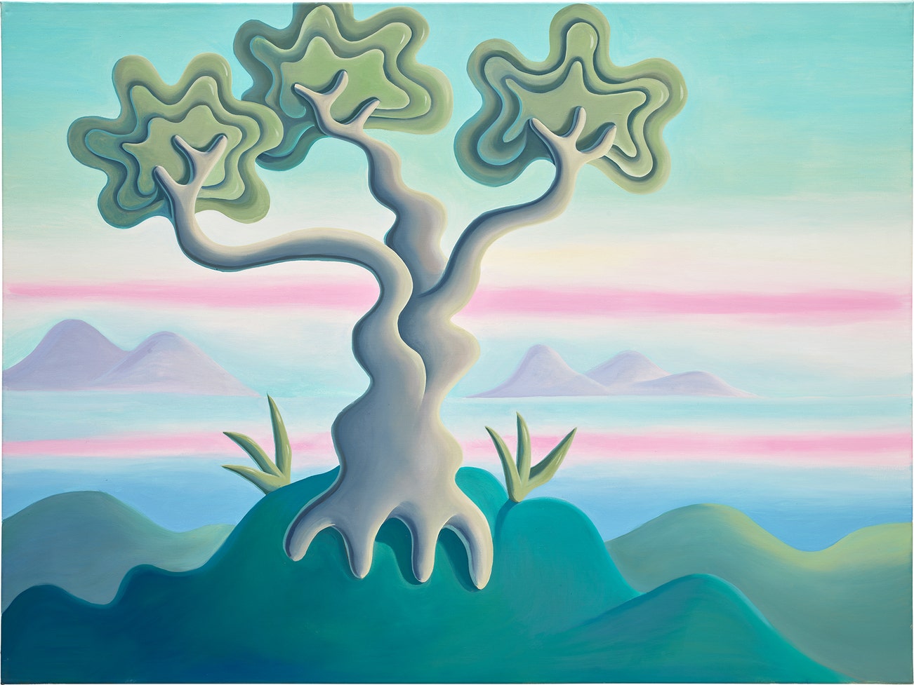 Dodd-Noble’s works feature cartoonish versions of canonical landscape painting. Through landscapes, she explores themes such as environmentalism and humans' relationship with nature. Her technicolored yet simple bucolic landscapes aim to spread awareness about environmental conservation.