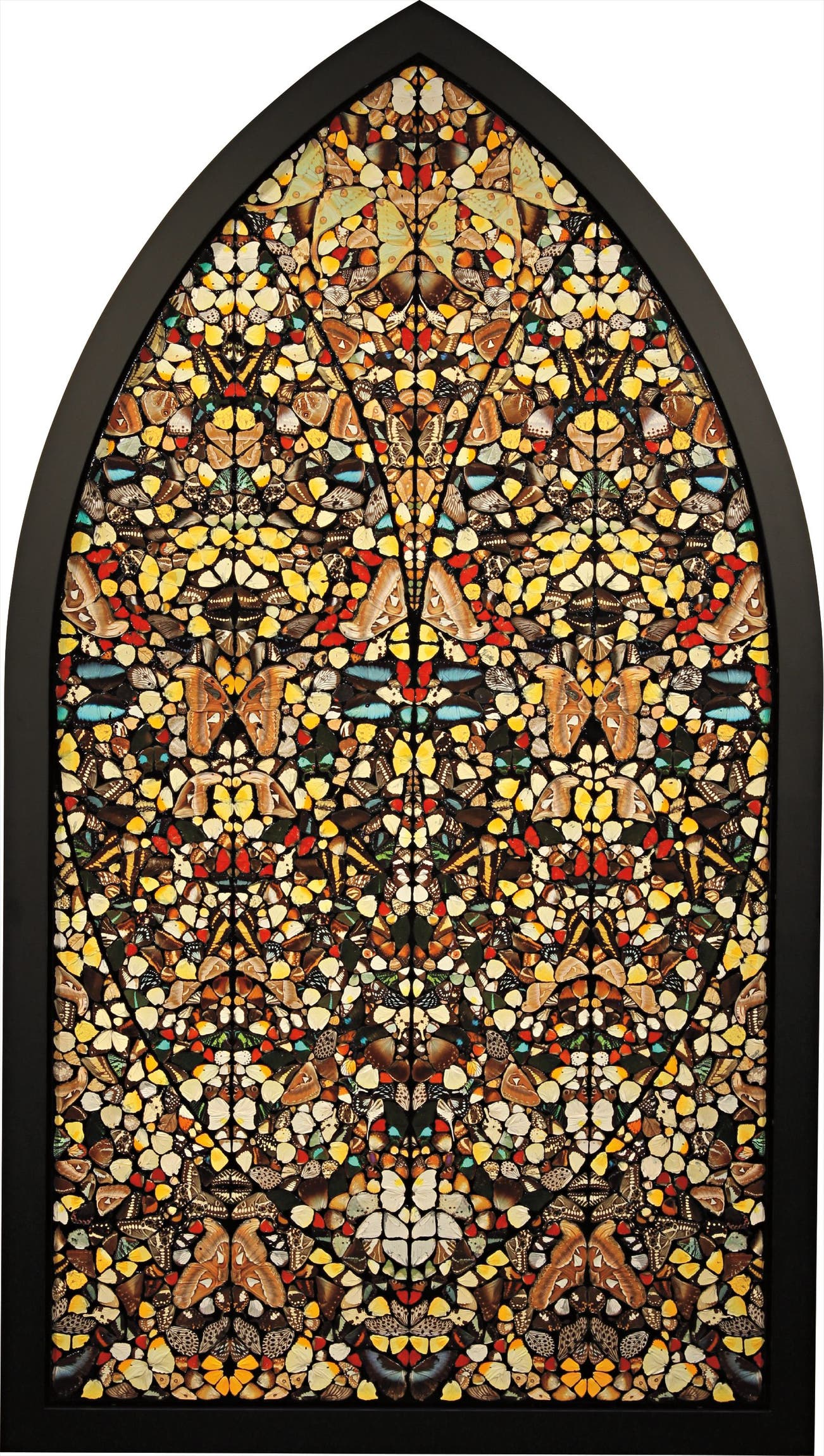 Sad Steps – Life Fulfilled belongs to Hirst’s Butterfly Grid series. Titled after Philip Larkin’s poem ‘Sad Steps’ from his collection ‘High Windows’, the work shares Larkin’s poetical interlacing of the beautiful with the ugly. Just as the spectator is confronted by the exquisitely kaleidoscopic arrangement of so many butterflies, the underlying reality of the artwork's medium also becomes apparent. Exploring ephemerality, the lyrical arrangement of Hirst’s butterflies adopts a poetry of its own through this carefully constructed artistic vocabulary. The butterfly is foregrounded due to its loaded symbolic connotations. Symbolising the soul, the butterfly is representative of the Ancient Greek goddess Psyche, as well as representing resurrection in Christianity, Hirst’s choice of butterfly wings as an artistic medium emphasizes religious notions of transformation and mortality. The artist's preservation of the butterfly wings prevents their natural decay, enabling them to appear in an eternal state of crucifixion in a world in which the artist plays God.