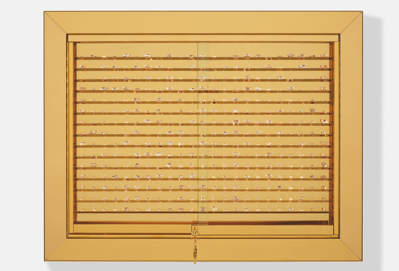 The work’s luminosity is further heightened by the use of gold-plated stainless steel to encase the diamonds, a departure from the silver stainless steel used in other cabinets. In perfect harmony, the clear stones emit a shine that bounces off of the gold background, serving as a unique study in the formal qualities of metallic tones. It is also the uniquely intimate size of the present lot that offers a more delicate depiction of the artist’s studies in life and death. In a scale imitating a wall-bound cabinet that one would find in their own home, the work invites the viewer to look even more closely at its contents. Together, each of these formal elements makes Tearful a stunning example of the Cabinets for which Hirst is best known, taking the artist’s prolific oeuvre to new formal and emotional heights.