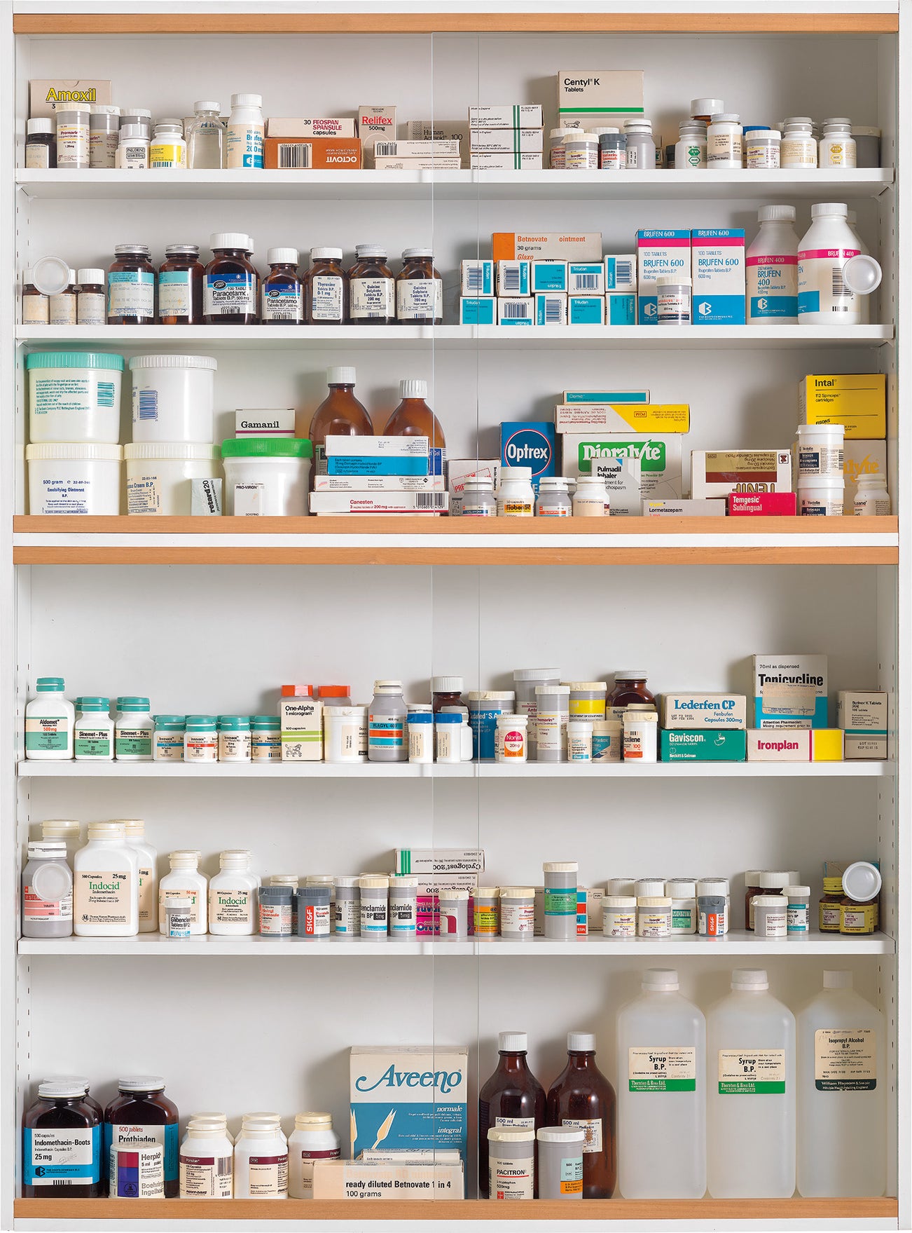 The cabinets’ arbitrary arrangements furthermore echoes the multiplicity of meaning that radiates from their enigmatic shells. Bodies, as such, is evocative of a plethora of visual references and historical notions. On the one hand, it provides an art historical nod to Kurt Schwitters’ collages and Joseph Cornell’s ingenious assemblages; on the other, it echoes the formal concerns of such seminal figures as Sol LeWitt and Donald Judd. In its artistic displacement of a real, recognisable object, the sculpture also calls to mind Andy Warhol’s Brillo boxes – culled from the environment of a supermarket – that indeed resonate with Hirst’s desire to have his cabinets look like those he saw in pharmacies. Being part of an endlessly ambivalent series, Bodies’ meaning seems perpetually in process, awaiting the thoughts and interpretations of its newcoming spectators. In a compelling anecdote, Hirst described the response of a particular viewer who had a distinct understanding of the drugs’ arrangement; having worked in the medical industry, she had in mind a physician’s very real and strategic placement of the medication packages. After staring at the object for some time, the viewer said she could not figure out Hirst’s cabinet; to her, it made no clinical sense, and was in fact a total mess – this, despite the fact it may have appeared exactly the opposite to an unsuspecting eye: neat, clinical and orderly.