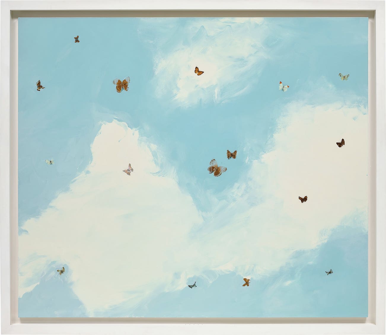 A wondrous, exceptional example of Hirst’s butterfly paintings, Summer Breeze is one of the few formulations of the Butterfly series evincing a non-monochromatic background. The sky backdrop in the present work amplifies the discrepancy that exists between the butterflies’ physical entrapment and their falsely unrestrained flight; as a result, the composition takes on an added poetic layer, whereby living creatures are sunk into an intangible vortex of air – impossibly glued to the summer breeze.