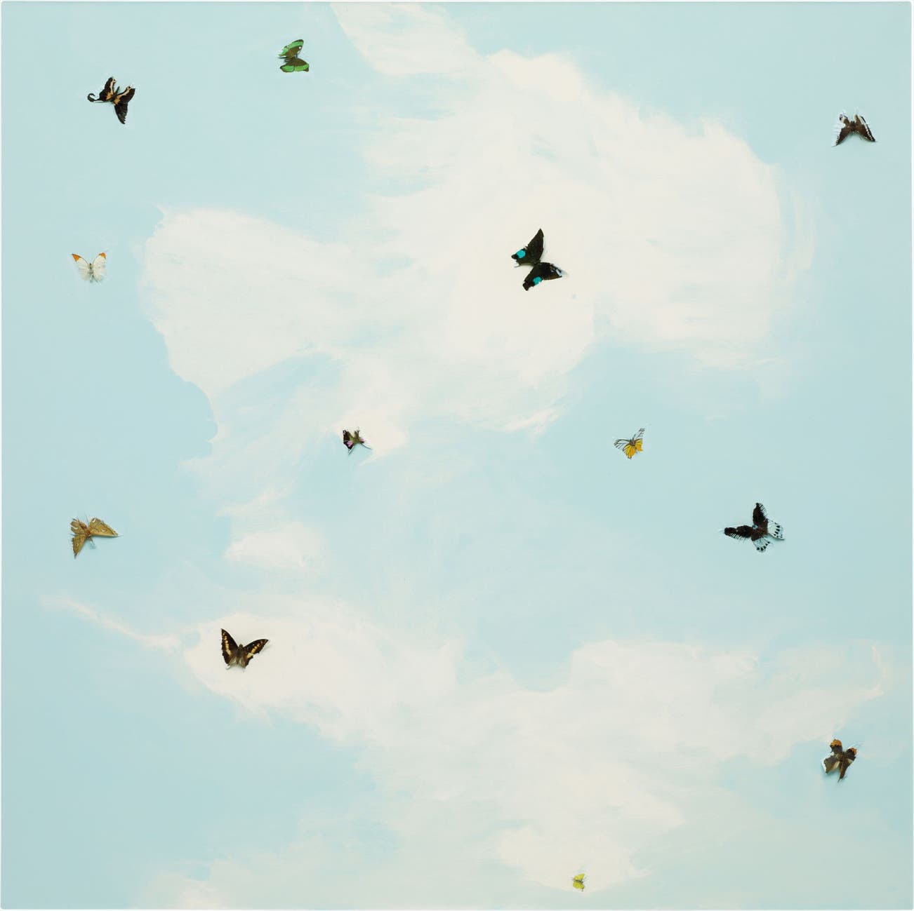 In the present lot the butterflies are set against a pale blue sky and puffy white clouds: “I don’t want it to look like a kind of oil-painted beautiful sky that’s been created. If you use it, thick gloss paint really does, in a very sculptural way, start to form fucking clouds. I want it to look like an accident of gloss paint with butterflies stuck on it.” (Damien Hirst in Damien Hirst and Gordon Burn, “On the Way to Work” Faber and Faber, 2001, p. 133) Captured mid-flight, the butterflies are placed in a way that is sometimes unpredictable; Hirst let the insects float upon the wet gloss paint and be absorbed naturally into the composition. The butterfly, an evasive insect with fragile and colorful wings, retains the essence of its beautiful short life even in its eternal death. Often a symbol for the soul, the butterfly, for Hirst, is the epitome of love and beauty and of the delicate world in which we exist.