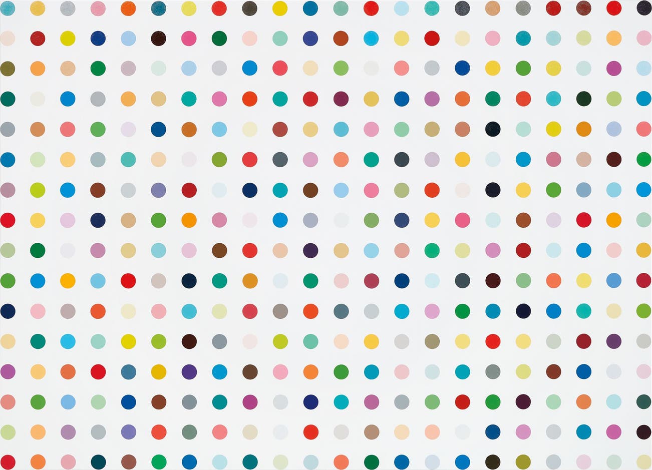Hirst’s minimalist and mechanical approach to separating colours on the canvas can be perceived as working in antithesis to the exuberant spontaneity of Abstract Expressionism that preceded his artistic training. Nonetheless, his style brings to the fore shared concerns about the materiality of paintings – where the flatness of the picture plane and presence of the medium is emphasised through the negation of illusionary depth or legible subject matters. In another way however, Hirst creates parallels with Pop Art through his appropriation of the spot that is heavily associated with Roy Lichtenstein’s paintings. Hirst even mirrored the artist’s sentiments saying his aim was to make the series appear as though it was made by '...a person trying to paint like a machine.' (D. Hirst, R. Violette, "On Painting Dumb," Damien Hirst: I Want to Spend the Rest of My Life Everywhere, with Everyone, One to One, Always, Forever, Now, London, 2005, p. 251). Nonetheless, what distinguishes the two artists most obviously is that for Lichtenstein the spot became a means to translate the cartoon format onto a canvas, whereas for Hirst the spot became a means to contain colour and by doing so, forms the basis of an abstract exploration into opticality and colour amalgamation.