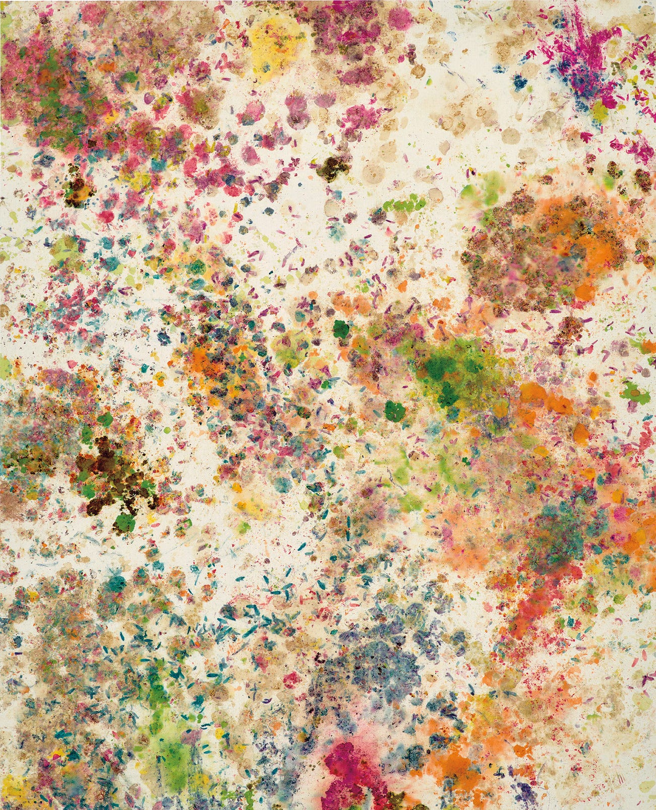 Questioning the painterly gestures of Jackson Pollock and the Abstract Expressionists, Colen cites the Pre-Raphaelites as an influence. Invoking the Pre-Raphaelites’ use of flowers to convey poignant symbolism, in the present work Colen explores both the anarchy and, conversely, order evident in nature. From his 2007 Nest installation at Deitch Projects, New York, to the present canvas, Colen’s work seeks to disrupt and challenge the limitations of painting, also seen in his Bubblegum and Birdshit paintings. With an anarchic abandonment Colen’s use of myriad organic mediums in his practice defies categorisation. Endlessly joyous in its evocation of colour and energy, Colen’s I Hate Work imbues the artist’s free and rebellious spirit.