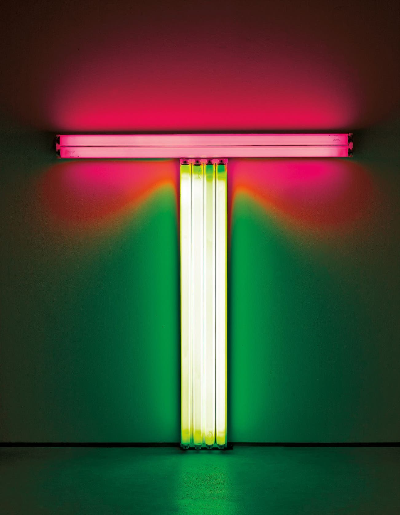 By using fluorescent bulbs, Flavin extended the scope of his media beyond that of his contemporaries - light transcends the material constraints of physical substances, becoming an immaterial yet prevailing medium in itself that could saturate its environment and illuminate its audiences. This sculpture is liberated it from the materiality, gestures, symbols and allusions that demarcated the Abstract Expressionist and Surrealist movements of previous generations. Any wall on which Untitled (to Don Judd colorist) 5 is installed immediately dissolves into the effulgent aura of pink and green that emanates from the beaming light fittings, causing the work’s setting and substance to fuse as one. As the viewer approaches, they too become enveloped by the work’s lambent atmosphere, entering into it as both spectator and component. The bulbs themselves are arranged in a manner that introduces a rigid geometry to the composition, with the vertical green bars and cruciform pink atop them. However, the way that the light bleeds from one colour to the other between these forms disrupts this rigidity, as does the involvement of the viewer, blurring the boundaries of the artwork itself.