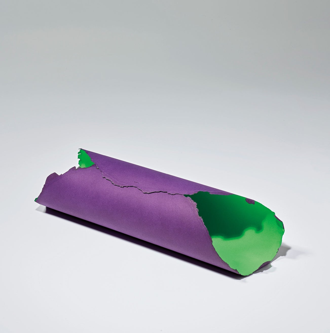 Double-sided mezzotint in purple and green (one on each side), on handmade paper, the full sheet rolled and fastened with a single stitch (as issued).