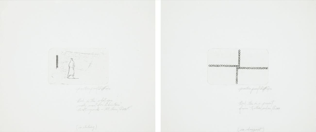 both signed, dated `1973', inscribed `Bob, this is a present from Kathran' and Dan. (in drypoint)' and 'Bob, is this what you really want for Christmas? Best regards - 'till then, Dan F. (in etching)' respectively and annotated 'practice proof' in pencil, both in very good condition, contained in a white linen covered portfolio.