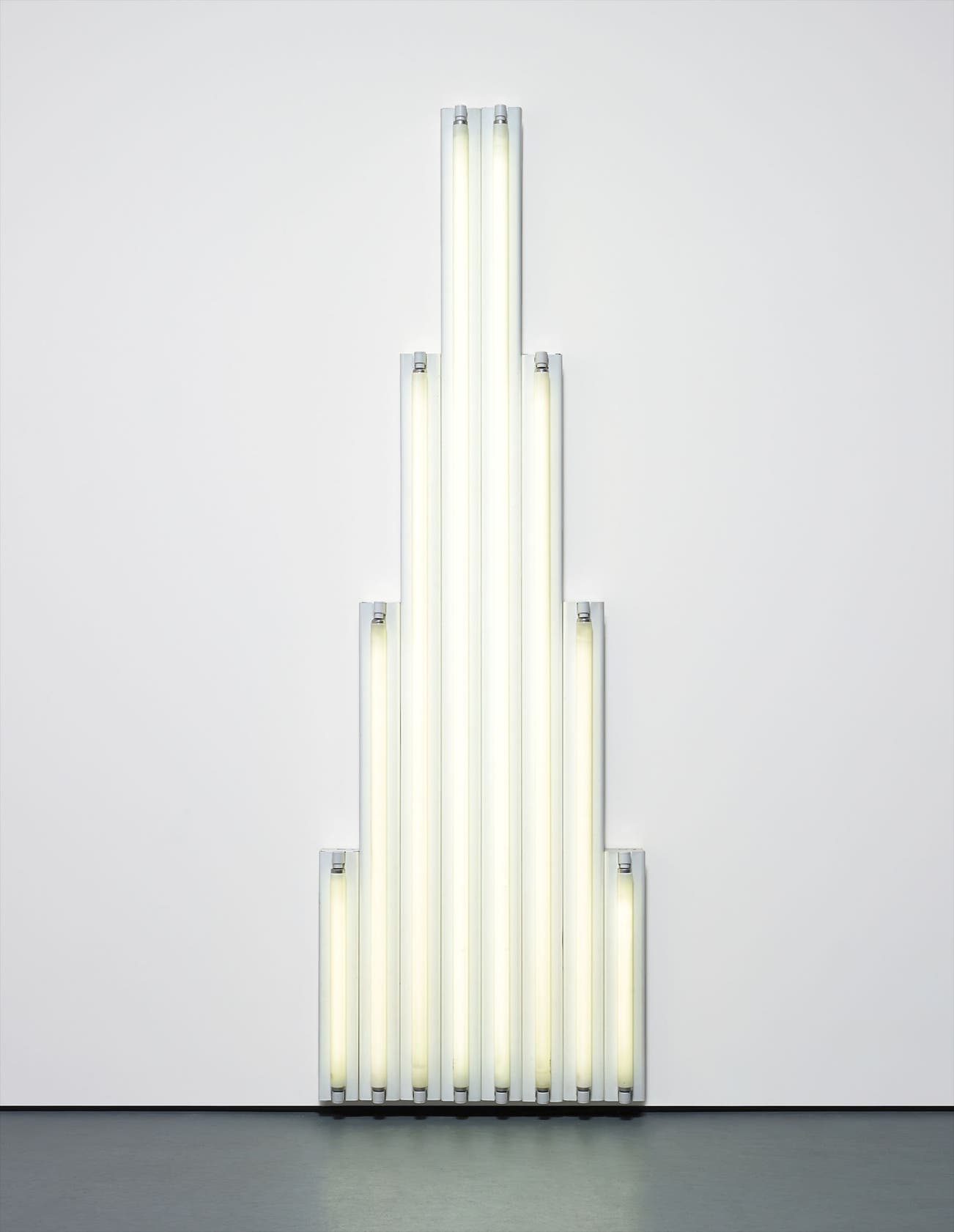 But the concrete nature of Flavin’s sculpture is only one aspect of its being. Casting its radiance upon the walls behind it and the floor below, Untitled breaks free of its material borders with unbounded energy, spilling brightness upon whatever surface happens to fall in its proximity. This fascinating second degree of sculptural expansion paved the way for countless artists to replicate its principles over the next three decades, including Tracey Emin and Bruce Nauman. The true marriage of engineering and form was no pipe dream for Vladimir Tatlin, though he may not have thought to seek it on such a contained yet explosive scale.