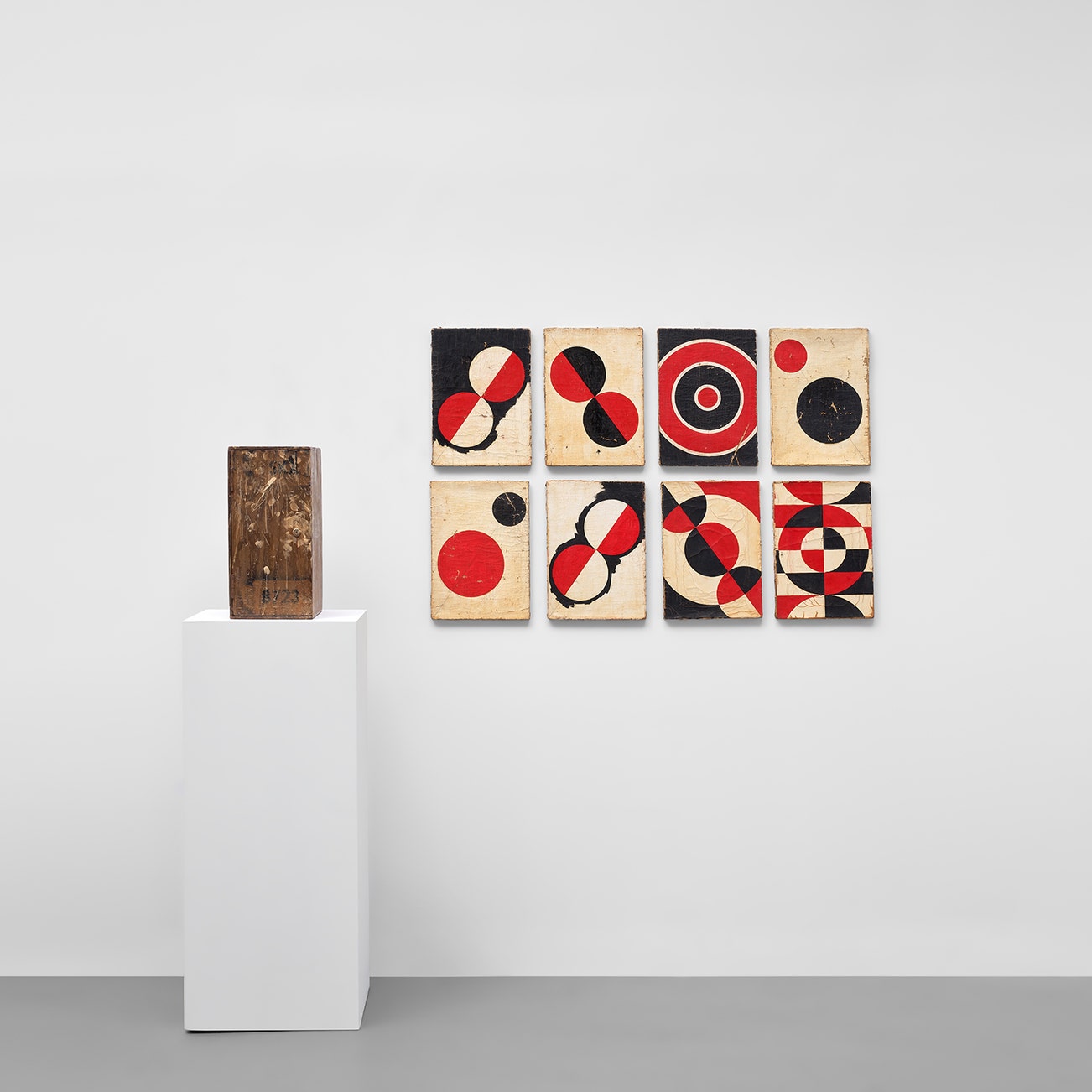 painted plywood, hardware and 8 oil on linen paintings