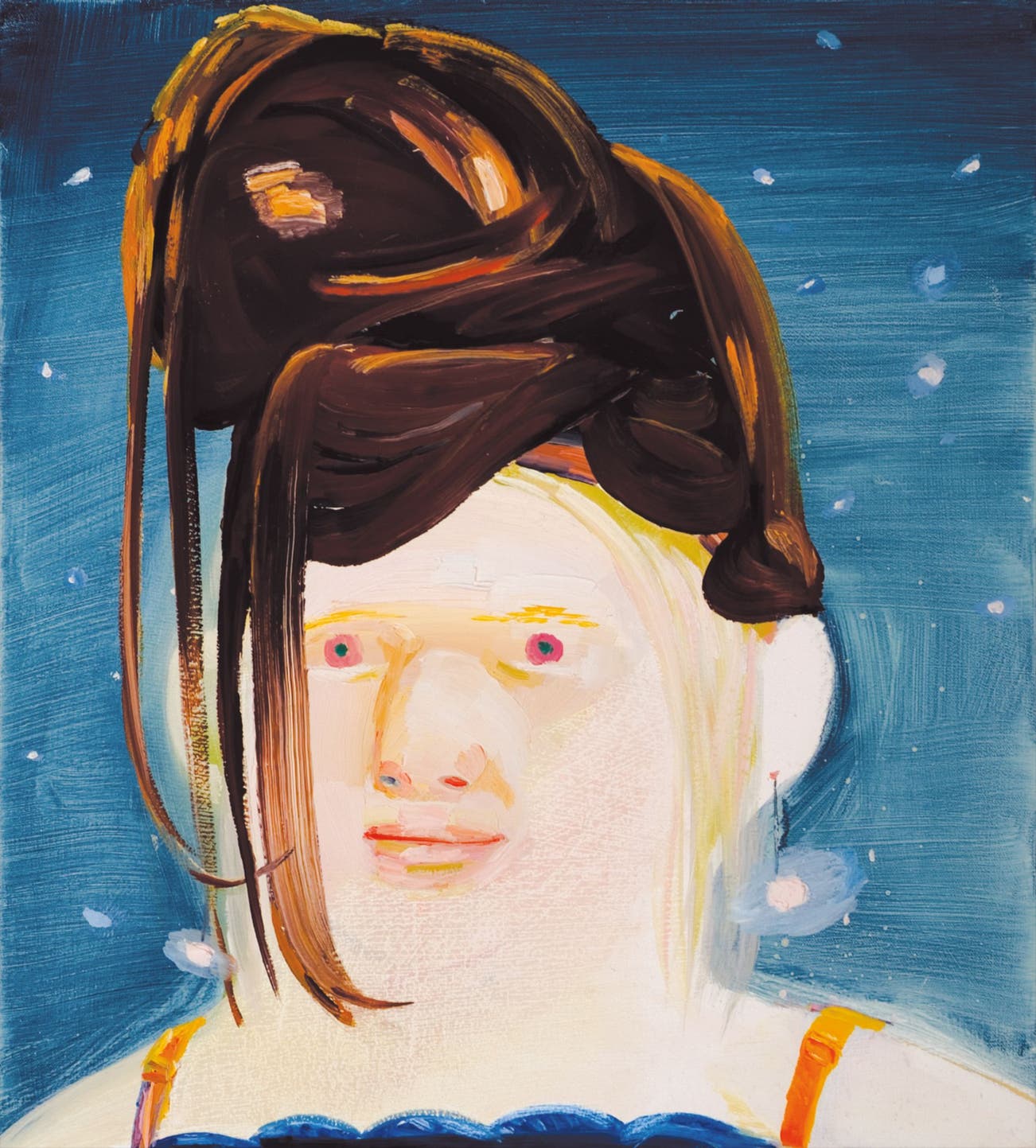 Dana Schutz's paintings represent a departure from the decadent figurative tradition seen I the second half of the twentieth-century. Her subjects have been selected directly from her imagination. Her metanarrative represents a fantasy which is at the same time a plausible reality. This portrait of an invented albino girl is the beginning and end of a portrayl which can only be found within the viewer's gaze and imagination. Disinterested in any conventional form of artistic classification in terms of genre, subject matter and style, Schutz's work are purely driven by the artist's imagination whose ever-changing nature leads to the impossibility of a define and fixed style. The expressionistic brushstrokes are so evidently present on the canvas that the viewer cannot avoid acknowledging the artist's power of creating life on canvas. This life is inevitably intertwined with art: each brushstroke interchanges between a painterly gesture and the depiction of the girl's flesh. The boldness of the colours and forms allude to an emotional approach to the canvas; the latter being a site where creativity and everyday experience of reality can be projected openly. The choice of subject has no shocking intent; instead the girl's grotesque, discomforting , mysterious and captivating appearance encourage narrative, ambiguity and empathy.