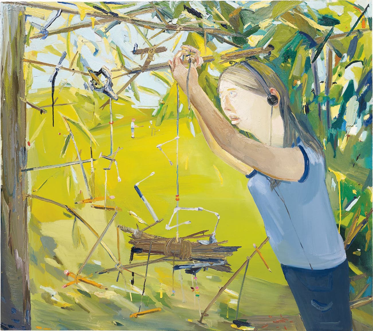 In Schutz’s kaleidoscopic Q-Tip Sculptor, the viewer is presented with a tableau that is at once familiar and strange. Before us, surrounded by a Kandinsky-like coppice, an engrossed young woman ties a bundle of sticks to a branch. Captivated by the task at hand, she wears headphones to occupy her as she works: whether music plays or she is merely blocking the sounds of the forest is unknown to us. As we stare into her fixed gaze, we wonder what is the purpose of her labor? As in many of Schutz’s paintings, Q-Tip Sculptor establishes a narrative tone yet refuses to resolve its meticulously assembled story elements. Schutz explains, “I don’t like feeling bound by a specific story or narrative, but I do feel that the paintings could be sort of self-contained stories. They contain events that imply action and outcome. I usually end up making stories around them despite myself.” (D. Schutz in interview with Maurizio Cattelan, April 2004) Indeed, in its maelstrom of chartreuse, periwinkle and hunter green, it is impossible not to build one’s own narrative when viewing Q-Tip Sculptor.