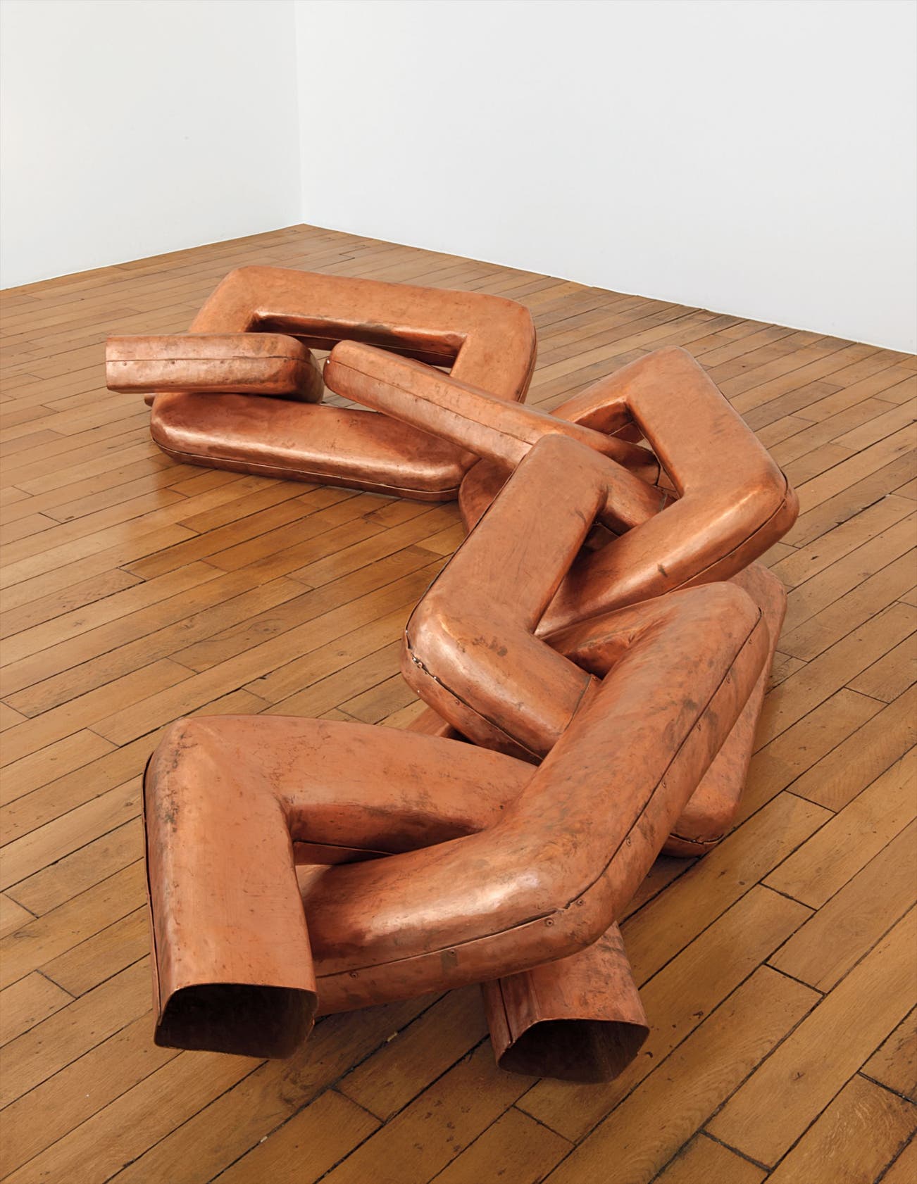 Danh Vō’s immersive project We the People (detail), 2011, seeks to dis-assemble the iconic and monumental Statue of Liberty into 400 uniquely crafted copper pieces. Working with fabricators in Shanghai, Vō recreates what he terms “the skin [copper sheathing]” of the statue. The present lot depicts the six copper links removed from Lady Liberty’s ankle. The chain, which appears at the foot of the statue, has been severed from its bolt, encapsulating the very essence of freedom for which she stands. Here, the shackles of the chain are rendered in a beautiful copper and with a subtle delicacy. Seeing the chain removed from its captive lends the work a sort of elegance and levity, as the links tumble over one another. It sits gracefully on the floor, standing in great contrast to the confinement and freedom it symbolizes. Vō explained to the Wall Street Journal that in choosing the State of liberty he "wanted to do something that everyone had a relationship to, and make it a bit unfamiliar. It's kind of like creating a Frankenstein that gets its own life." (K. Ramisetti, Exhibition in New York Gives New Perspective on Statue of Liberty, Public Art Fund's 'Danh Vō: We the People' Gives Viewers a More Intimate, Abstract Look at Statue, The Wall Street Journal, May 15, 2014)