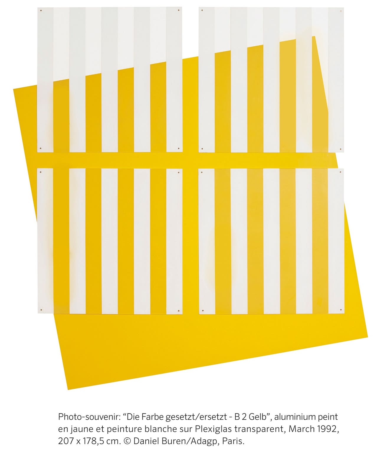 Photo-souvenir: "Die Farbe gesetzt/ersetzt - B 2 Gelb", aluminium peint en jaune et peinture blanche sur Plexiglas transparent, March 1992, 207 x 178,5 cm. © Daniel Buren/Adagp, Paris. Photo: Phillips
