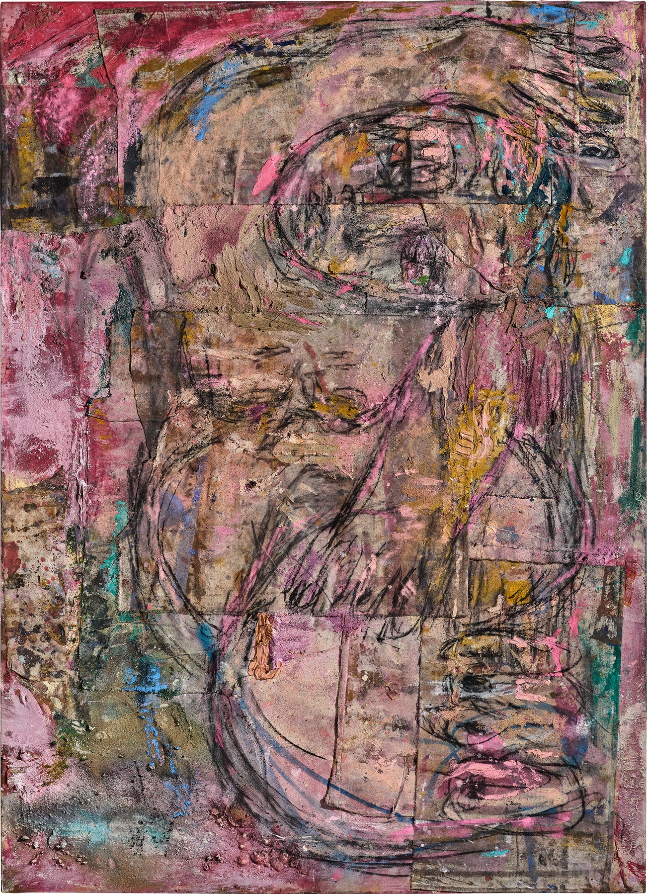 oil, oil stick, acrylic, ink, charcoal, spray paint, sand, coarse pumice gel and collaged fabrics on canvas