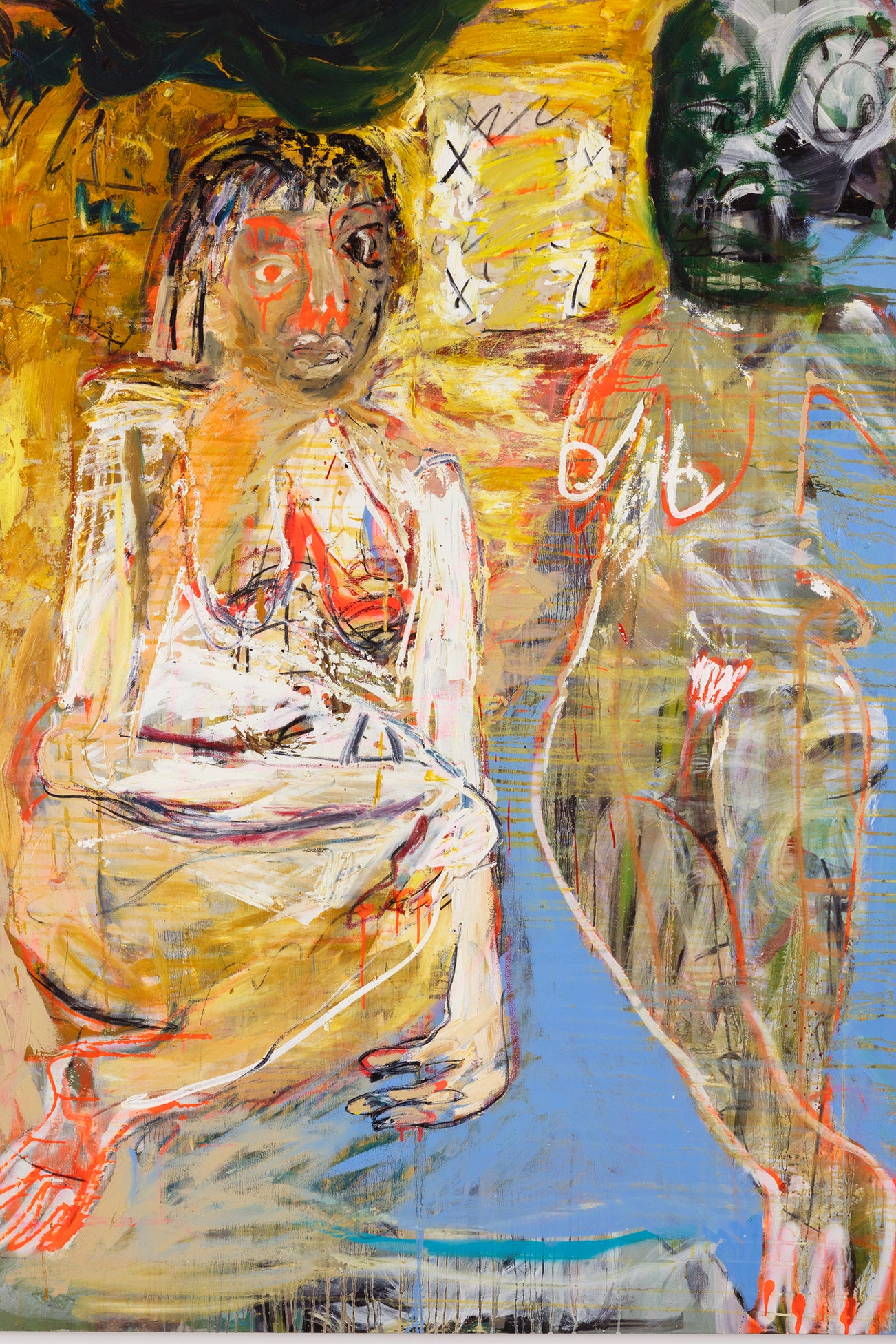 oil, spray paint, pastel, charcoal, sand and collage on canvas