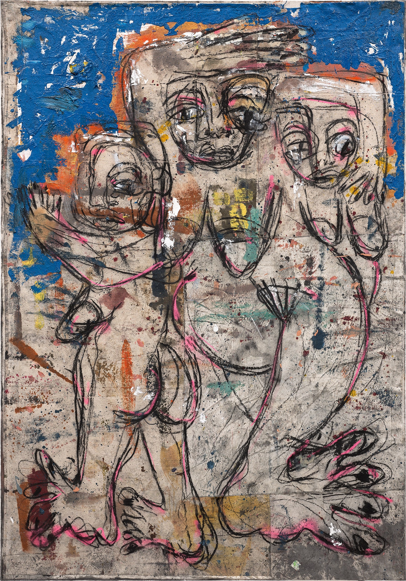 oil, acrylic, spray paint, charcoal, pastel, ink, coarse pumice gel, collaged fabrics and staples on canvas