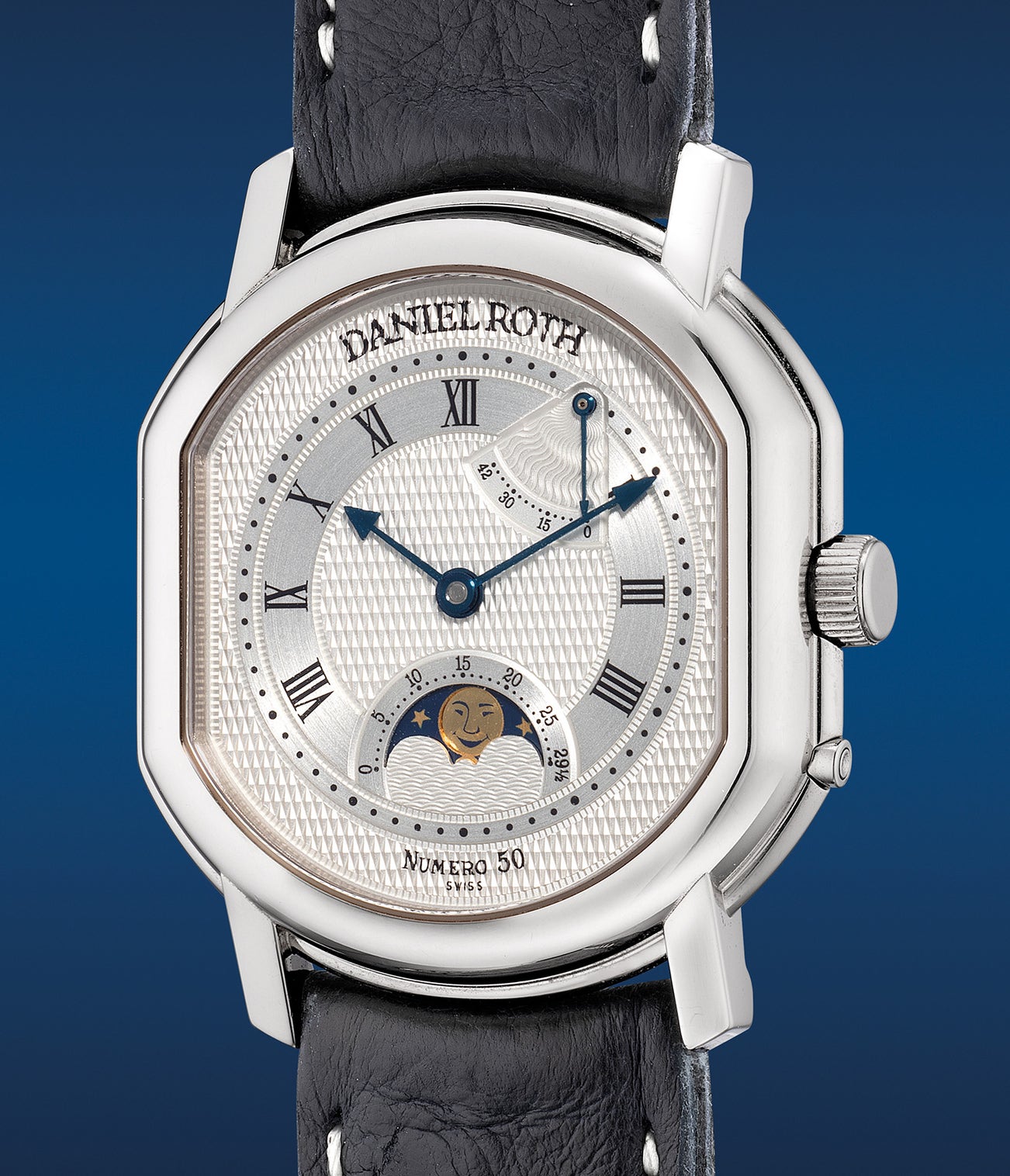 The present Daniel Roth in white gold belongs to a limited edition series of 50 pieces made in 2000 to commemorate the new millennium prior to the sale to Bulgari. Featuring the firm’s distinctive double ellipse case and a guilloche dial with Roman numerals and blued stainless steel hands, the aesthetics are familiar. Equipped with moon phases and a power reserve indication of up to 42 hours, the sapphire display caseback features Roth’s manual tonneau-shaped cal. DR 900. Numbered 50 of a limited edition of 50 pieces, the present example is the last ever to leave its manufacture. Preserved in excellent overall condition, this rare Roth wristwatch is one to keep a closer eye on.