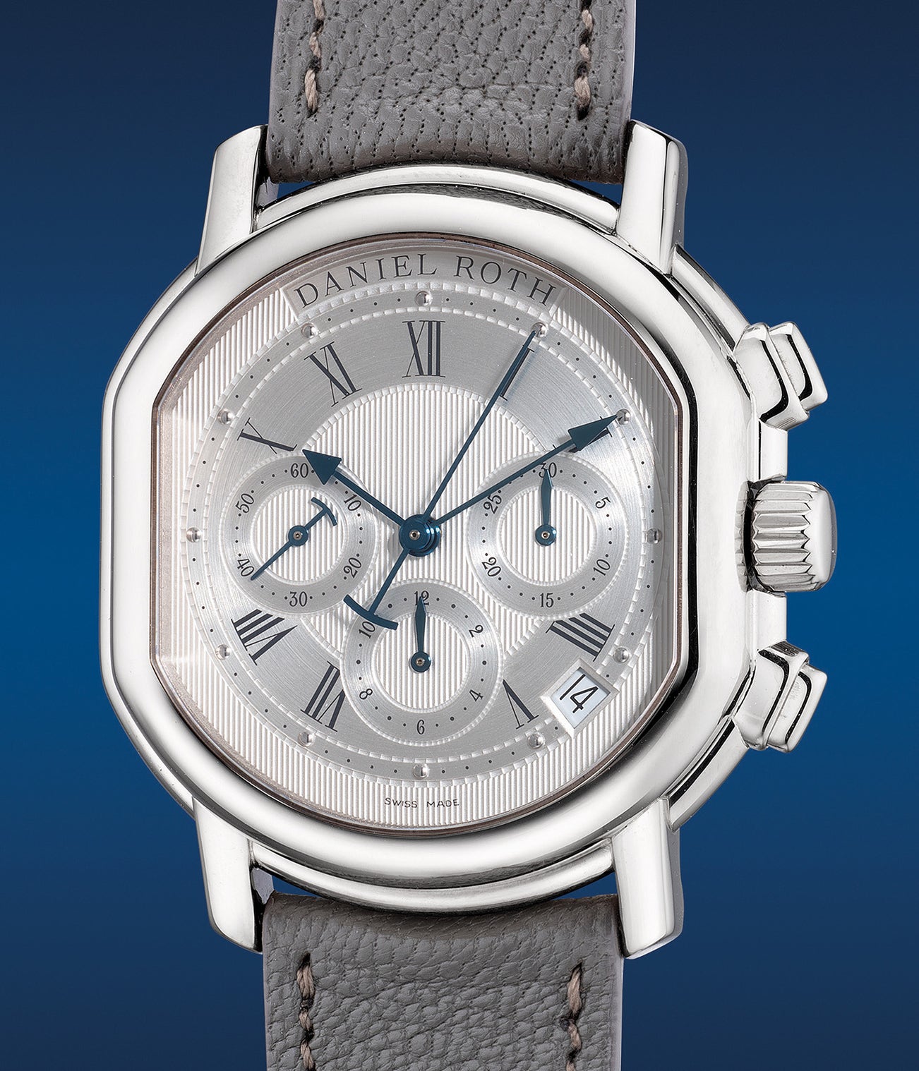 The present lot with the double-ellipse case fitted with bright white pinstriped guilloché dial, blued steel hands, brushed chapter ring and Roman numerals numbered 271 would be a classy additional for collectors looking for early Daniel Roth chronograph pieces.