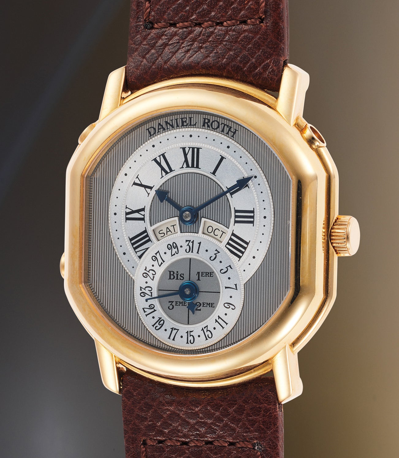 The present example in yellow gold is a rare, early variant with two apertures for the day and month. Although Roth and Dufour never achieved their goal of it being an instantaneous perpetual calendar, it is a great opportunity for collectors to acquire a Daniel Roth timepiece developed together with the respected Philippe Dufour.