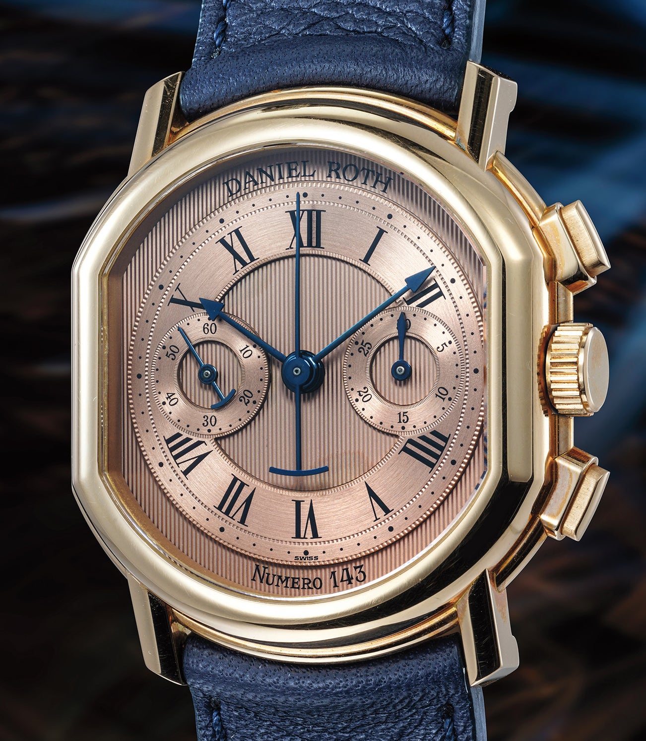 This chronograph in pink gold with superbly attractive pink gold dial with hand guilloché vertical pattern will please collectors not only thanks to its ultimate rarity, good looks and use of iconic movement but also due to the fact that it represents a pioneering and audacious era that saw the rise of independent watchmaking.