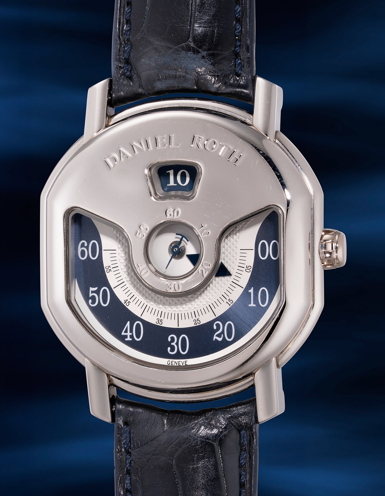 - Three variants in different case metals and dial colours were released, including a white gold version with a silvered dial, pink gold version with rhodium black dial, and arguably the most alluring, a platinum version with a blue steel dial. Encased in an iconic platinum Ellipsocurvex case, the present timepiece is instantly recognizable as a Daniel Roth watch, and it boasts a distinctive dial design with two apertures showing the charismatic jumping hours and small seconds respectively.