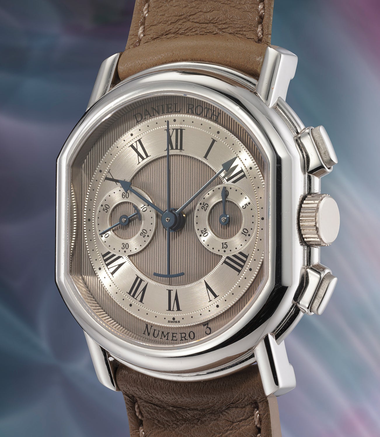The present chronograph in platinum from 1992 with white gold contrasting dial is a sight to behold. The closed caseback features the beautifully hand engraved initials CR in a floral motif. In a letter dated 9 April 1992 from Daniel Roth to the owner Mr Rosmino, the master watchmaker writes that he appreciates the client’s support and that he will reserve every future Daniel Roth number 3 for him.