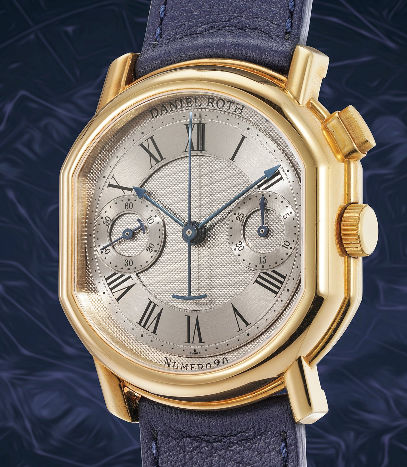 The present monopusher chronograph, launched in the early 1990s, is a prime example of Roth’s mastery. It is powered by a vintage Lemania 15CHT (or 2220) ébauche from the 1930s, a movement revered for its heritage and craftsmanship. Only 52 pieces were originally produced—16 in platinum and 36 in yellow gold, like this example. This timepiece numbered 20, features a striking case that exudes a unique and elegant style. More than just a watch, it stands as a tribute to Daniel Roth’s lasting legacy and his significant influence on the world of independent watchmaking.