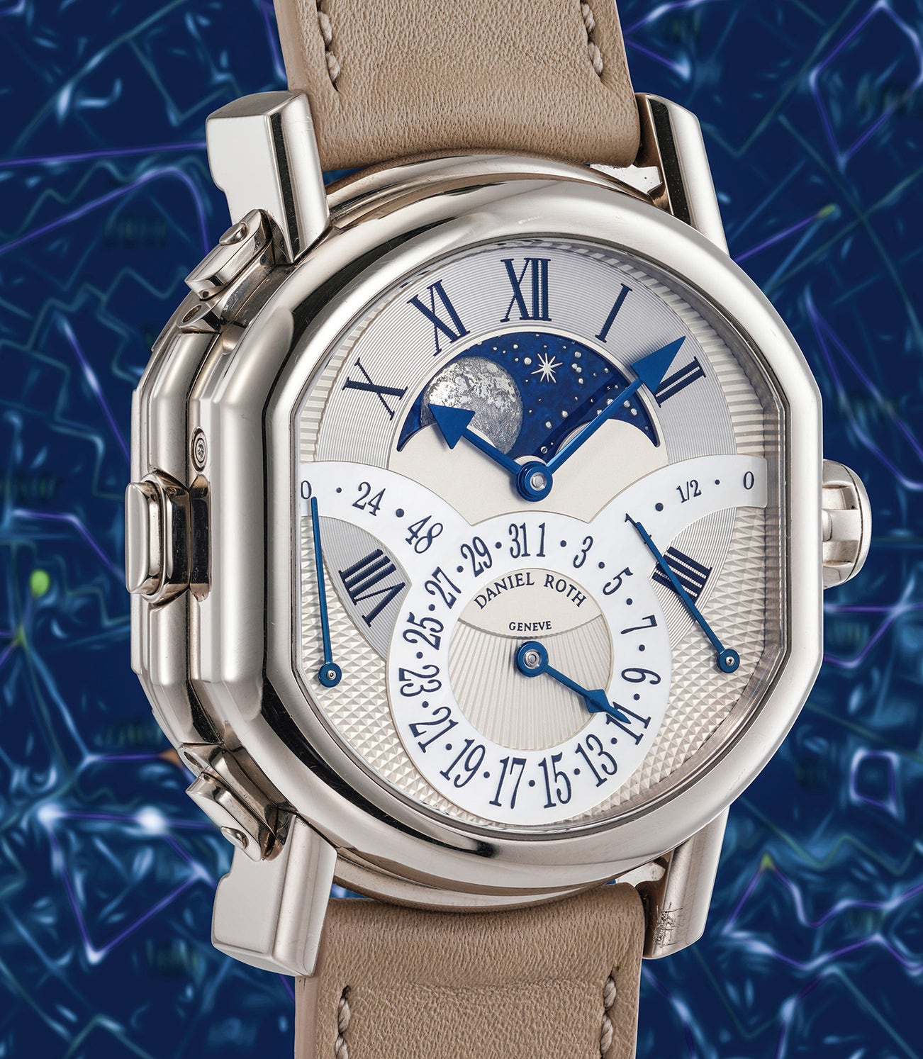 The present Daniel Roth is more than a Grand & Petite Sonnerie; it also features a tourbillon visible through the caseback as well as two retrograde power reserves (for the movement and Sonnerie). The date at 6 o’clock, all on an elegant mother-of-pearl chapter ring and a superbly hand-engraved moonphase display at 12 o’clock.