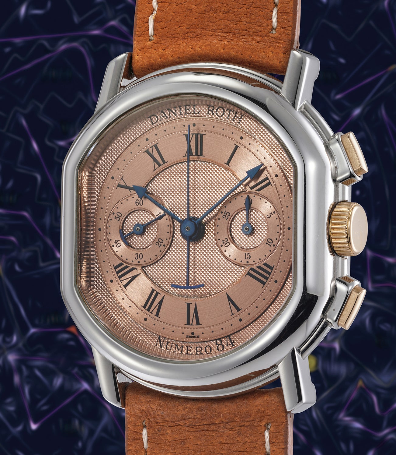 Upon launch of his brand in 1989, Roth immediately established his personal design language, the most obvious being the unusual ellipsocurvex shape, hands with pointed tips and dials with guilloché patterns (either Clous de Paris or horizontal stripes). The present chronograph bearing number 84 houses the iconic Lemania 2320 also known as CH-27 movement that Roth refined and started reusing during his time at Breguet and used by other greats such as Patek Philippe for their references 5070, 3970 and 5970, Roger Dubuis, Vacheron Constantin and of course Breguet. Featuring an incredibly appealing palette, the present variation appears to be particularly hard to find: the cases of the model are most often found in monochrome white or yellow gold, with some pieces in rose gold. Two-tone variations seem to be a minority of the production. The dial is full 18K gold and engine-turned by hand, as confirmed in the Certificate. The salmon color is incredibly appealing, featuring a multitude of metallica hues which shift according to how the light hits the complex guillochage and brushed hour track.