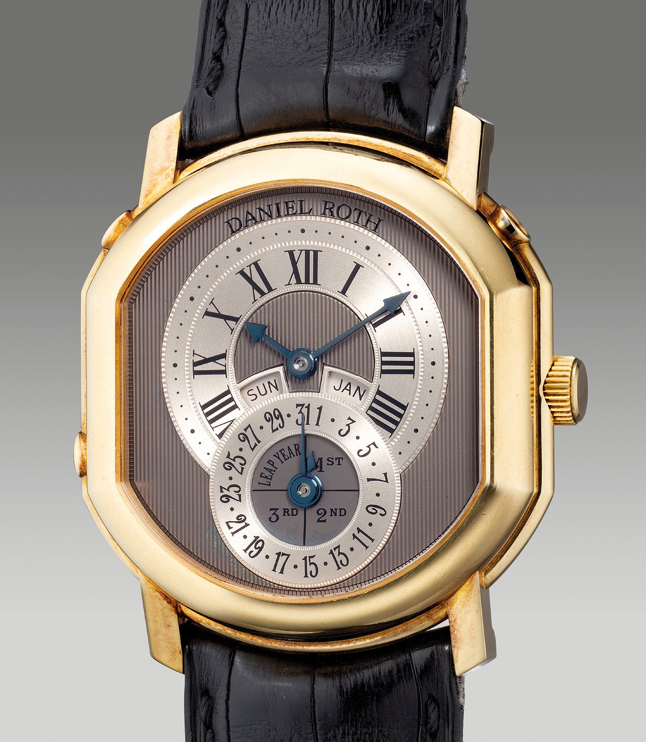 The present example in yellow gold is of the rare variant from the earlier examples with two apertures for the day and month. Although Roth and Dufour never achieved their goal of it being an instantaneous perpetual calendar, it is rather interesting and a great opportunity for collectors to acquire a Daniel Roth timepiece developed together with the respected Philippe Dufour.