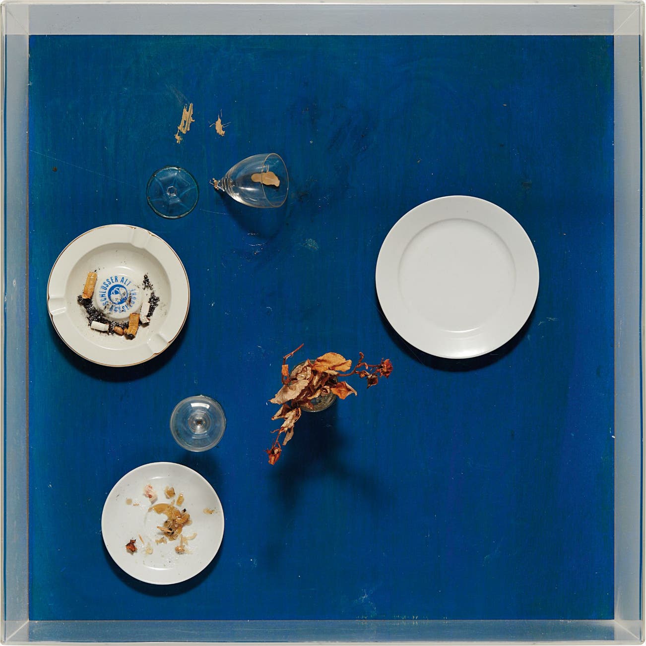 assemblage of tableware, dried flowers, cigarettes and adhesive on painted wood
