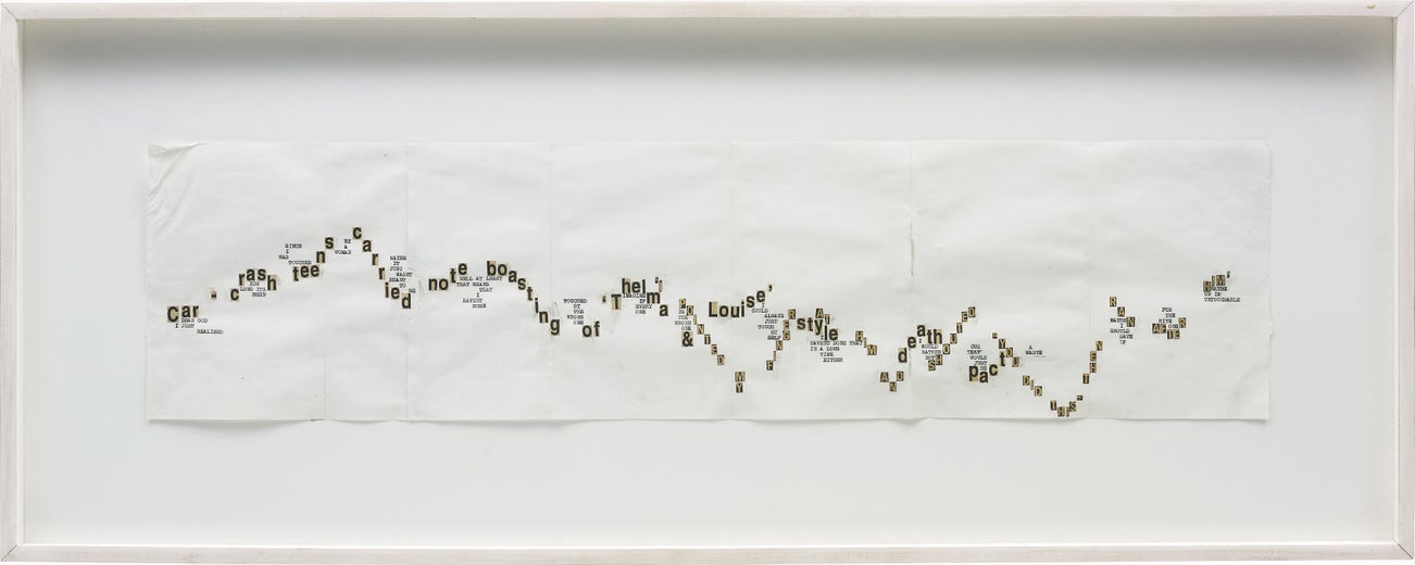 newspaper collage, typewriter ink, Tipp-ex and tape on paper, in artist's frame