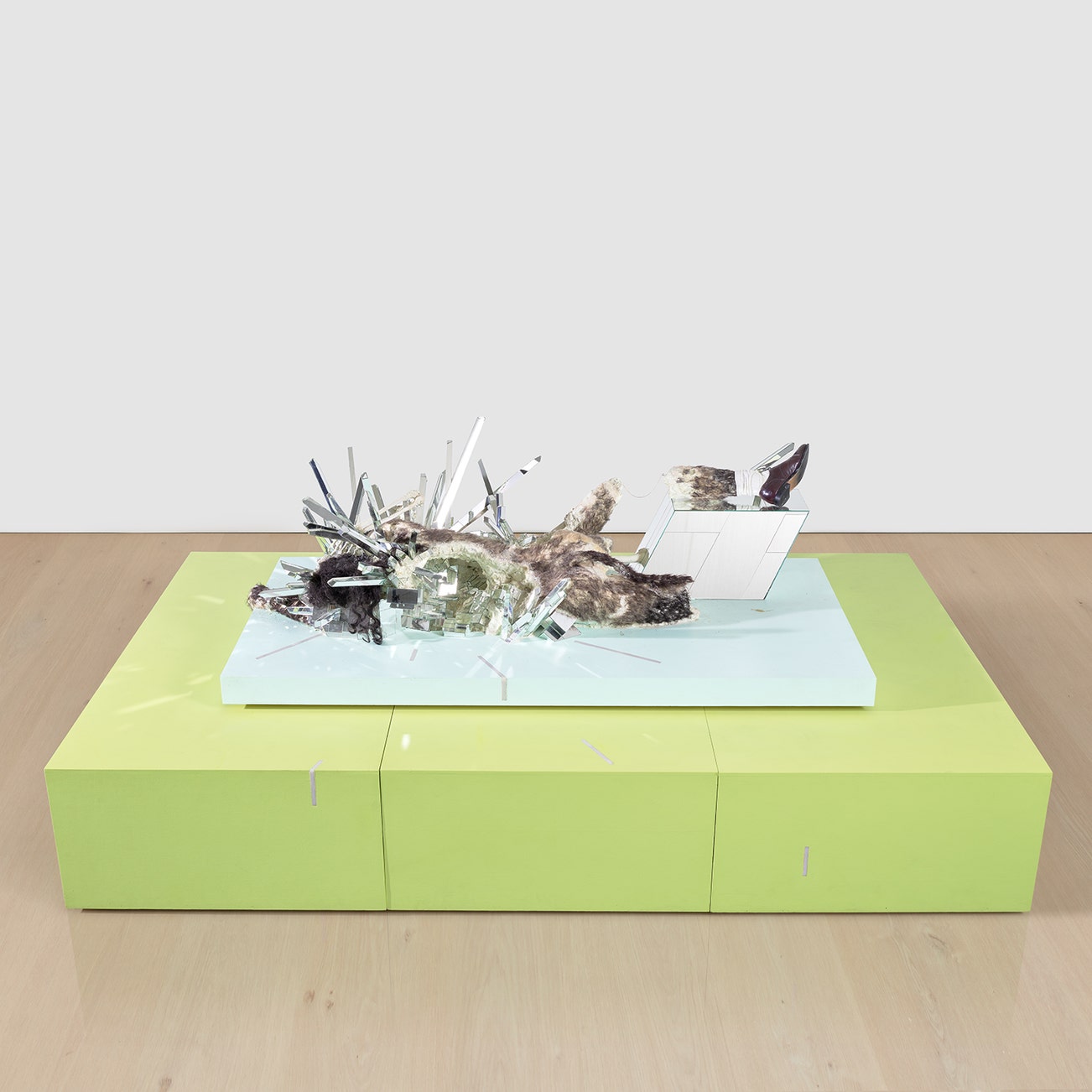 wood, paint, Plexiglas, clay, glue, mirror, foam, resin, electric lighting system, synthetic hair, digital watch, shoe, fabric, chain, wire and glitter