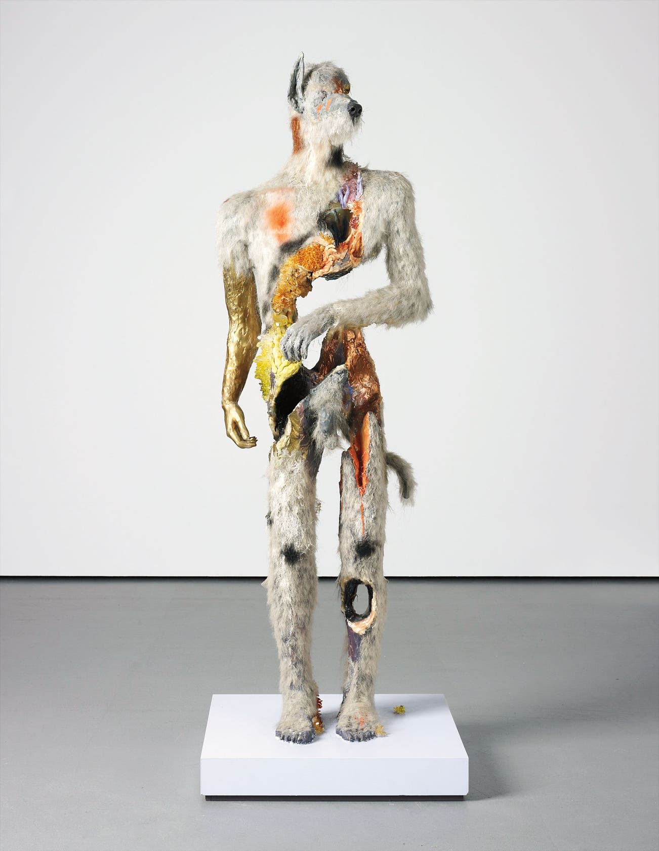 wood, foam, epoxy resin, epoxy clay, mineral crystals, synthetic hair, paint, plastic wolf nose