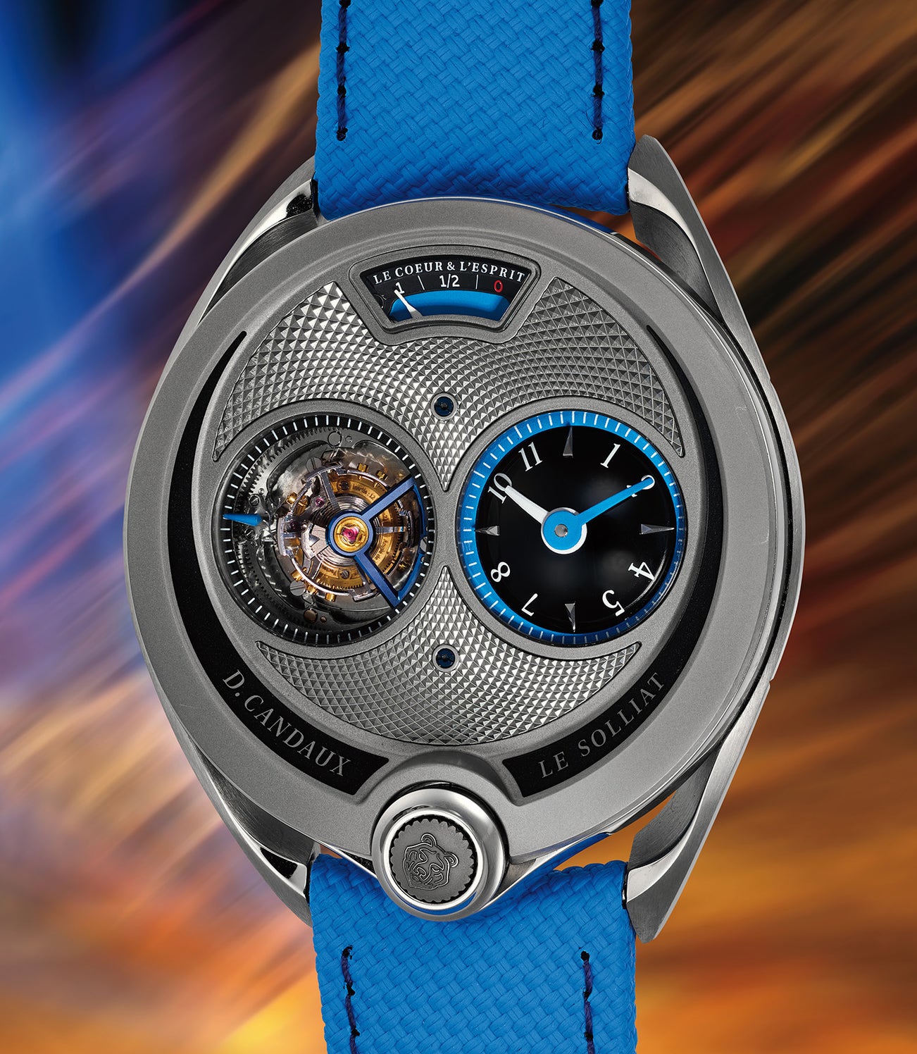 Beneath two spherical sapphire domes, the DC6 presents its indications asymmetrically. The right dome houses the timekeeping display on a raised, micro-curved dial with blued, curved steel hands, while the left dome reveals the 30° inclined flying tourbillon that improves chronometric performance by traversing more positions in less time. A third, arched sapphire crystal covers the power reserve indicator at 12 o'clock.