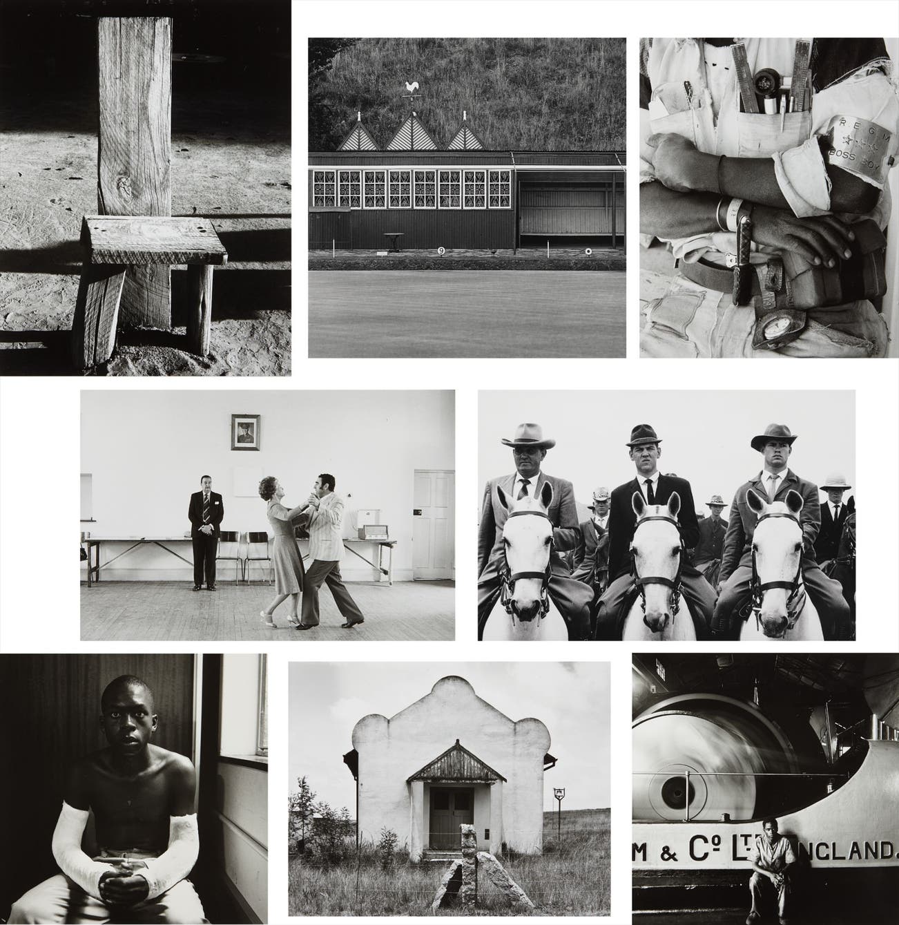 Titles include: Bowling Club, Crown Mines, Johannesburg Banker's Chair of Mining Timbers, Luifaarekaki Estate Gold Mine, Vrougusdorf; De Wildt, Transvaal Nederbuid Gereformeerde Kerk, Loghair, Transvaal; 'Boss Boy', Battery Reef, Randfontein Estates Gold Mine; Ballroom dancing teacher, Ted Van Rensburg, watches two of his pupils swinging to the music of Victor Sylvester and his orchestra, in the old Court House, Boksburg; A Commando Escorting the prime minister and leader of the National Party, Hendrik Verwoerd and his wife, Betsy, to the party's 50th anniversary celebrations, De Wildt, Transvaal, South Africa; Lawrence Matjee after assault and detention by the Security Police; The Moths' Hall, Old Court House, Boksburg; Greaser No. 2 North Winder, Randfontein Estates Gold Mine