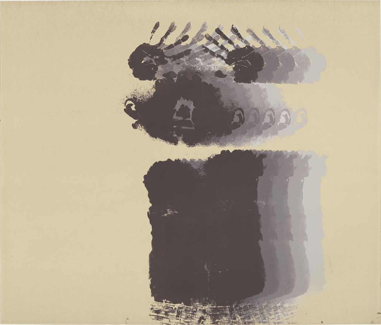 Appearing both fleeting and tangible in the present work, Hammons’ body creates a gradient in colour moving from right to left through consecutive imprints. This dynamism conveys vitality on the two-dimensional plane, a concern explored by some of Hammons’ artistic predecessors such as Marcel Duchamp and Yves Klein. Using his body as a tool, Hammons transports his physical presence to the forefront of his artistic practice. Re-examining the self-portrait, in the present work the mythic artist is un-romaticised, becoming the central subject matter which steals our gaze. The outlines of Hammons’ nostrils, hands, ears and torso form a characteristic imprint of the artist who has laid himself bare, his body and art unified as a joint statement, which inform and consolidate each other as one.