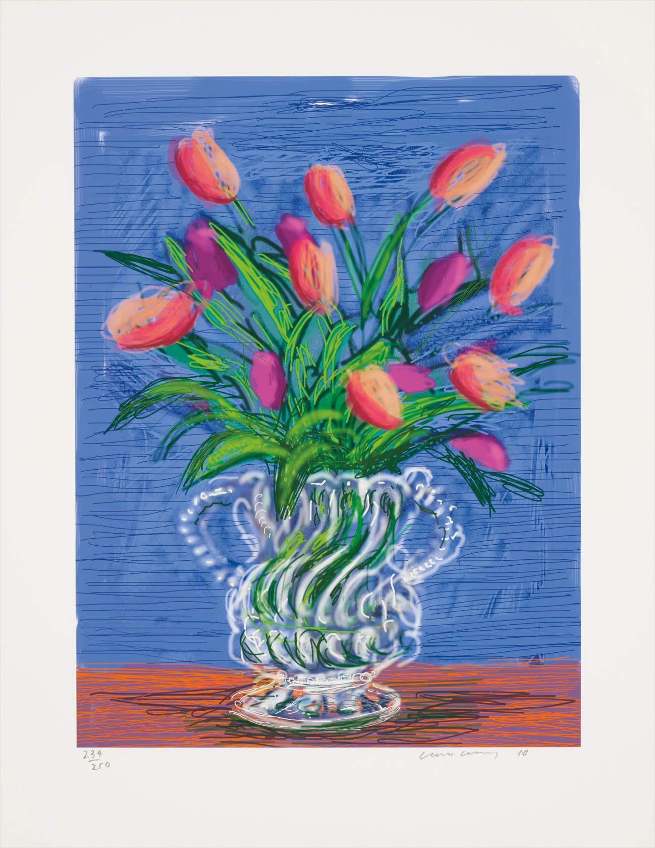 Hockney has exhibited at the Museum of Modern Art in New York, the Royal Academy of Arts in London, and the Van Gogh Museum in Amsterdam, among many other institutions. On the secondary market, his work has sold for more than $90 million.