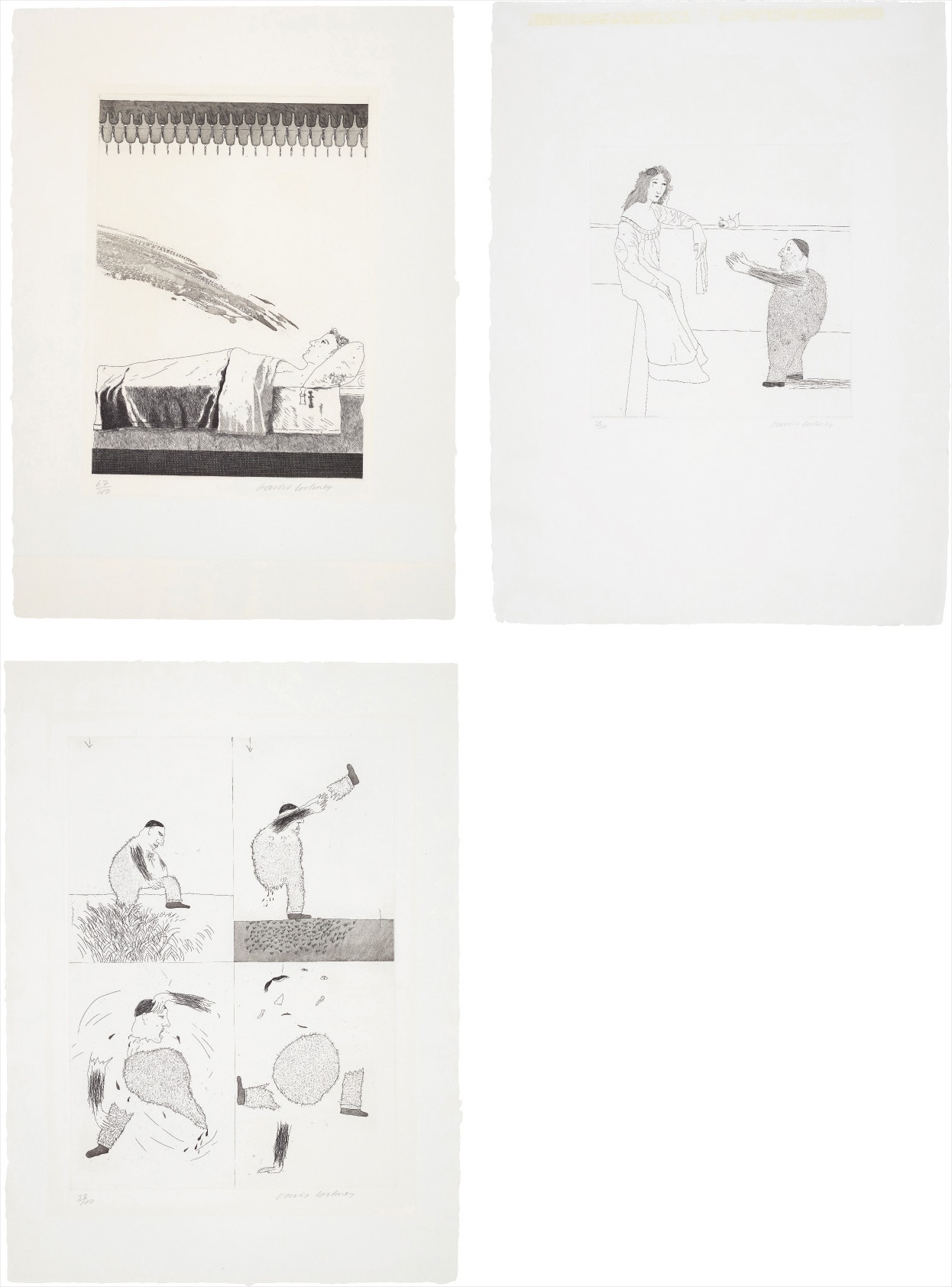 Each signed and numbered 67/100, 24/100 and 58/100 respectively in pencil on the front and inscribed 'Grimm Portfolio' or 'GP' in sepia ink (faded) on the reverse (there were also fifteen artist's proofs and a total book edition of 460 copies), co-published by Petersburg Press, New York and Kasmin Gallery, London, one framed.