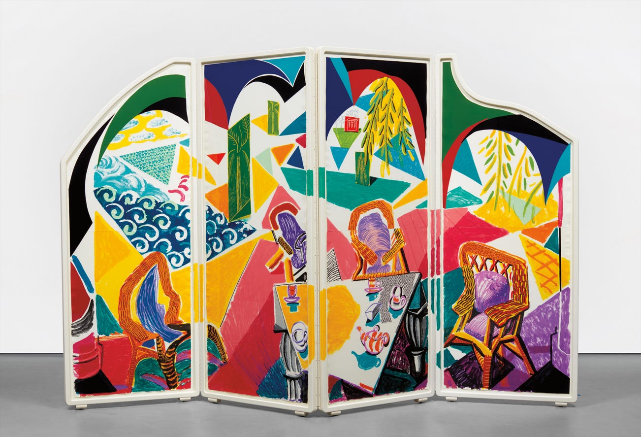 One of the most daring and monumental projects undertaken by David Hockney, Caribbean Tea Time presents a stunning large-scale lithograph partitioned onto four panels of a folding screen. Completed in 1987, this incisive work depicts four wicker chairs around a table and tea set in an arcaded veranda with an imaginative geometric pattern speckling the reverse side of the screen. As an innovative artist inclined to careful observation, Hockney incorporates a myriad of influences and interests into this work, from his exploration of the mechanics of vision - including stylistic allusions to late Cubism and his own stage designs and photographic collages. With a strong artistic relationship to the opera, having designed sets beginning in 1975 for Glyndebourne, the Metropolitan Opera and the Royal Opera House, Hockney’s smooth transition from traditional canvas to folding screen speaks volumes about his ability to push the limits of depicting the complexities of a three-dimensional world through two-dimensional art forms.