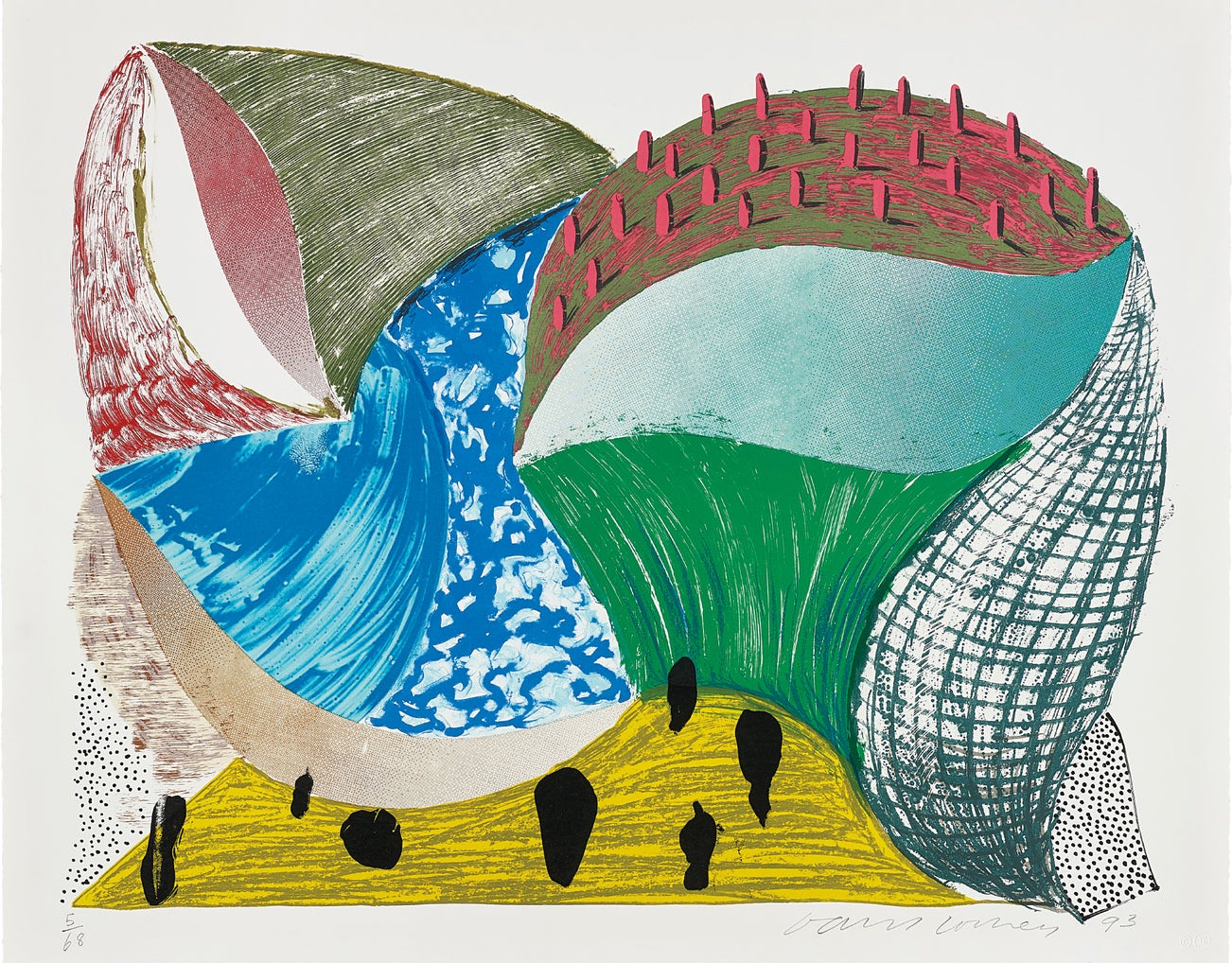 BritishDavid Hockney (b. 1937) is one of the most well-known and celebrated artists of the 20th and 21st centuries. He works across many mediums, including painting, collage, and more recently digitally, by creating print series on iPads. His works show semi-abstract representations of domestic life, human relationships, floral, fauna, and thechanging of seasons.