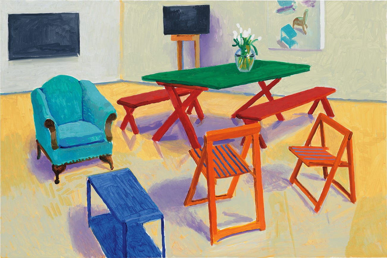 Since the 1980s, Hockney has made works in series, relentlessly pursuing the same format until its aesthetic possibilities were exhausted. In the case of the present work, Study Interior #2 belongs to an eponymous series that spotlights the same furniture from different angles and in varying guises, with one armchair, two wooden chairs, two benches, a large table and a coffee table presented as a vivid assemblage, respectively coloured with acidic cyan, blood orange, carmine red, electric blue and leafy green. The collection of objects, together, function like interdependent agents; they are not claustrophobically assembled to fit in the composition’s frame but instead dispersed to fill the space they inhabit.