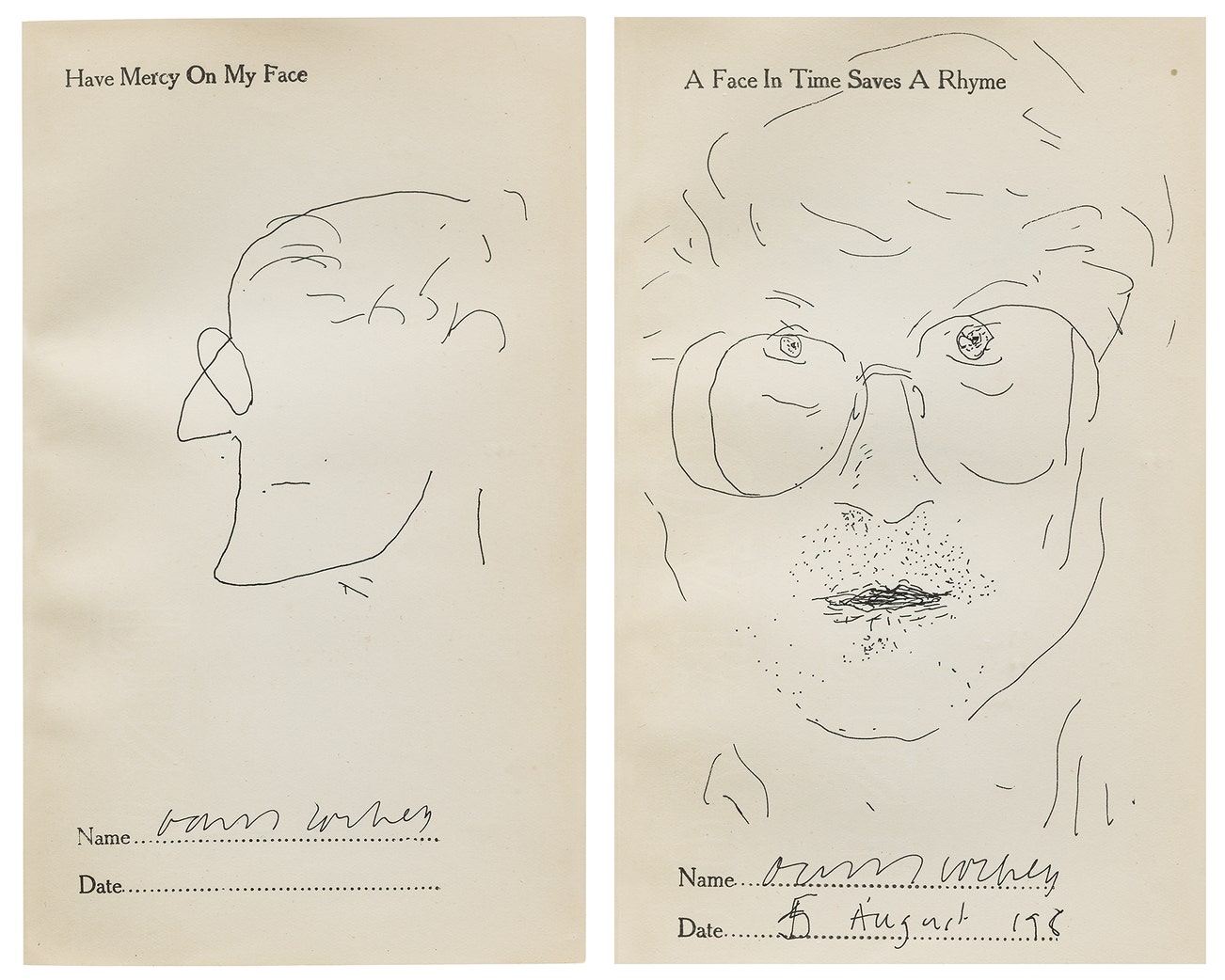 Two pen and ink drawings, on wove paper, bound within a leather-covered Edwardian parlour game book entitled The Faces of My Friends, a further 22 ink drawings by the artist’s family and friends, including his mother Laura, sister Margaret, and Ian Falconer from the period 1982-1984, and drawings from circa 1910 at the beginning of the book.