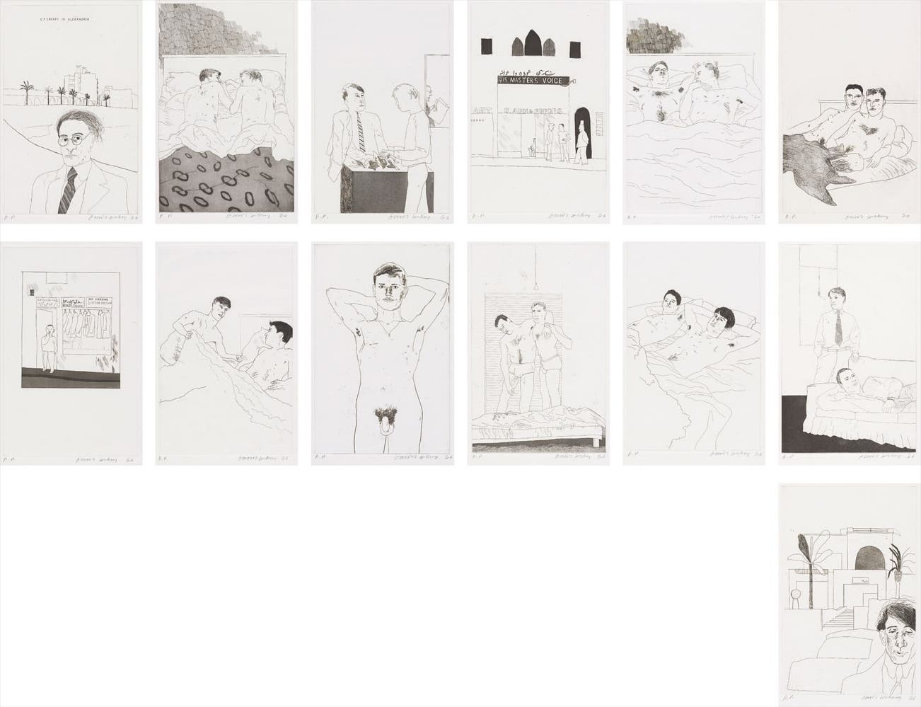 Titles include: Portrait of Cavafy in Alexandria (Pl. 1); Two Boys Aged 23 or 24 (Pl. 2); He Enquired after the Quality (Pl. 3); To Remain (Pl. 4); According to Prescriptions of Ancient Magicians (Pl. 5); In an Old Book (Pl. 6); The Shop Window of a Tobacco Store (Pl. 7); In the Dull Village (Pl. 8); The Beginning (Pl. 9); One Night (Pl. 10); In Despair (Pl. 11); Beautiful and White Flowers (Pl. 12) and Portrait of Cavafy II (Pl. 13).